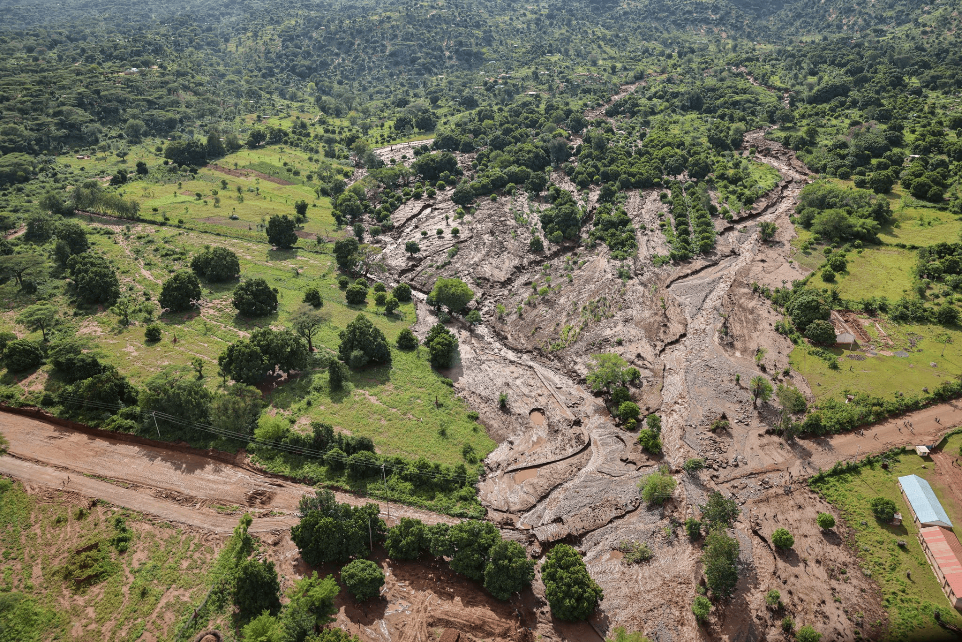 La Cruz Roja de Kenia difundió imágenes aéreas que muestran extensos deslizamientos de tierra y advirtió que el acceso a varias comunidades sigue siendo complicado por las inundaciones y carreteras dañadas.