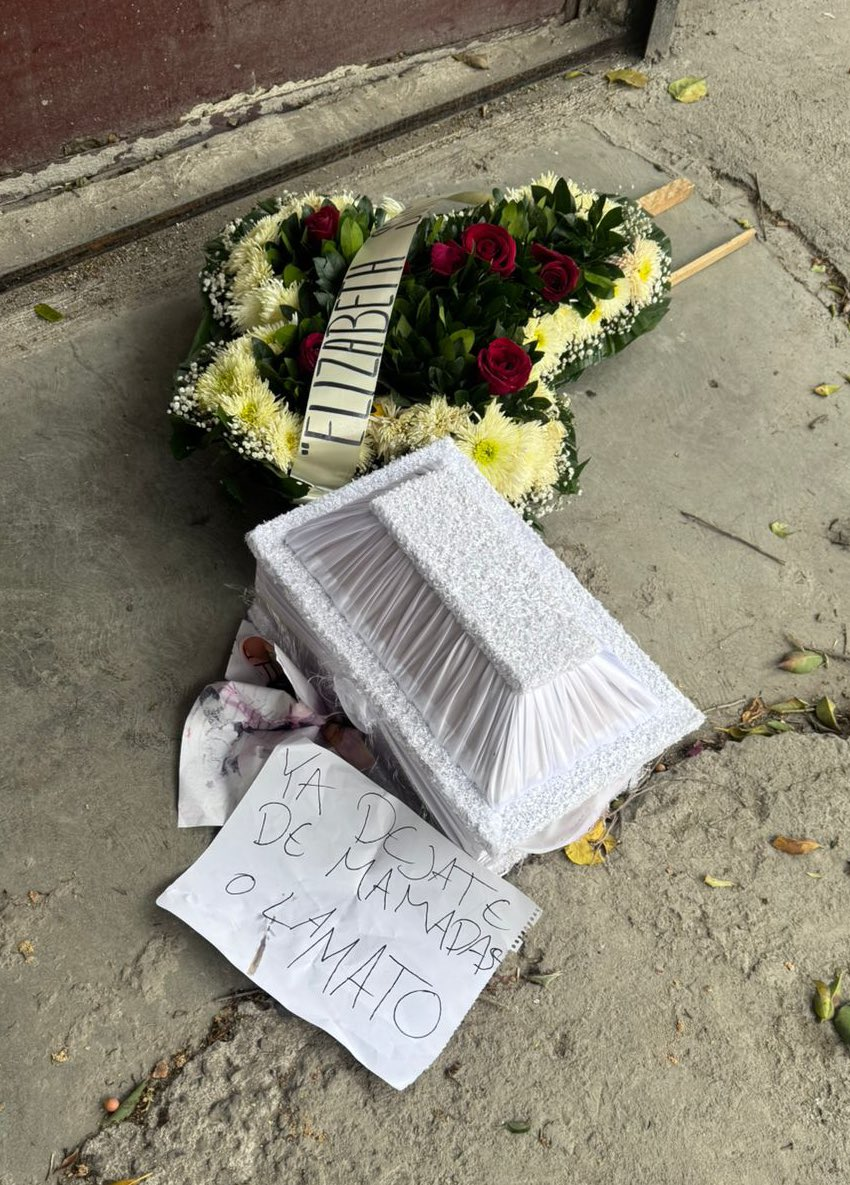 Afuera de su domicilio dejaron una corona fúnebre, un ataúd simbólico, fotografías de su hija y un mensaje intimidante: “Ya déjate de mamadas o la mato”.