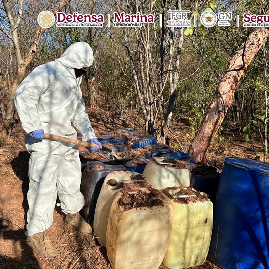En otra acción, en Cosalá, Sinaloa, al realizar funciones de reconocimiento, se localizaron e inhabilitaron 11 áreas de concentración de material diverso para la elaboración de drogas sintéticas, se aseguraron 16,486 litros y 75 kilos de sustancias químicas.