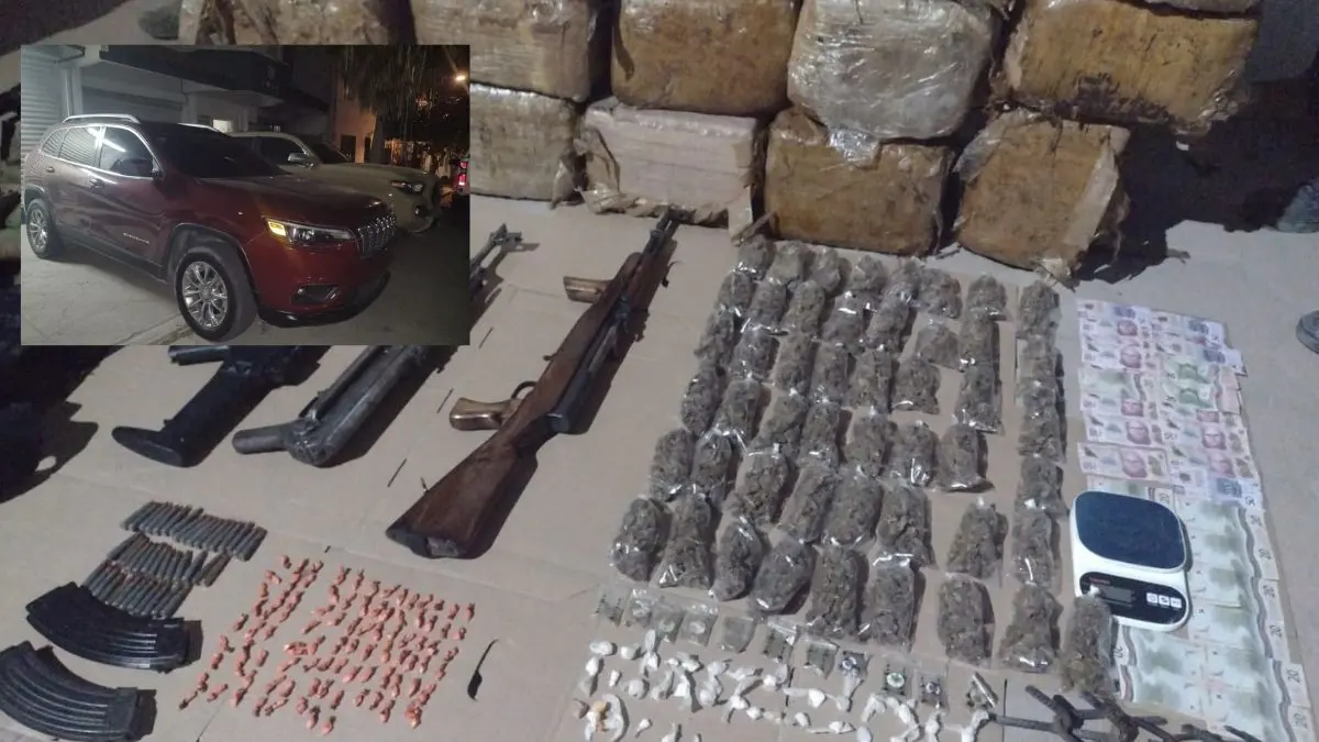 El hallazgo ocurrió cuando los marinos localizaron dos vehículos aparentemente abandonados, por lo que al proceder con la inspección hallaron en los dos vehículos tres armas largas, dos cargadores, 42 cartuchos, tres chalecos tácticos, 23 poncha llantas y 240 kilogramos de presunta droga con características similares a la mariguana y 61 gramos de cristal.