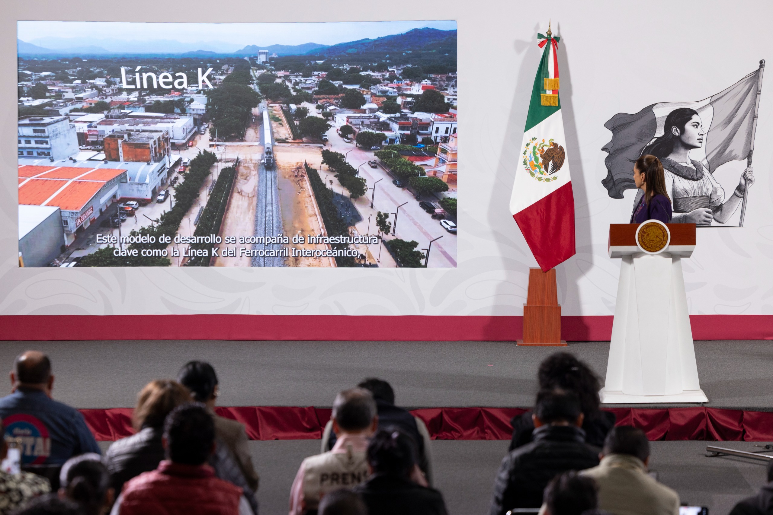 Sheinbaum Pardo resaltó que el Tren Interoceánico impulsa un modelo de desarrollo integral con perspectiva social y económica, al mejorar la calidad de vida en comunidades del sur-sureste. Recordó que el tren ya ha sido utilizado para el traslado de automóviles y subrayó que su propósito es atraer inversión, generar empleo e incorporar a las comunidades al crecimiento económico tras años de rezago en la región.