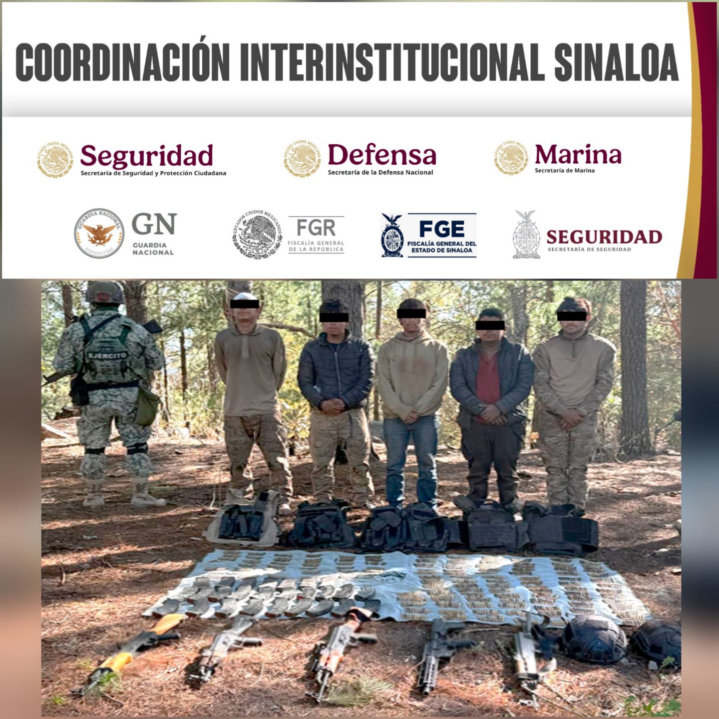 BADIRAGUATO, SINALOA – Tras una emboscada contra fuerzas federales en la comunidad de Mesa de Palma, el Grupo Interinstitucional logró la captura de cinco presuntos delincuentes y el aseguramiento de un arsenal que incluía armamento pesado y equipo táctico avanzado.