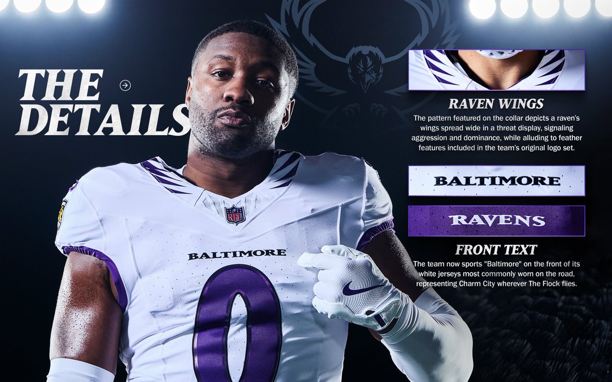 Más allá de los colores, la indumentaria está cargada de simbolismo y tecnología. Se introdujo el tono «Midnight Purple», un acabado que cambia de intensidad según la luz, imitando el plumaje real de un ave. Además, por primera vez en la historia, el jersey de visitante lleva la palabra «Baltimore» en el pecho, un gesto que busca fortalecer el vínculo emocional con la ciudad. Los detalles en los cuellos y pantalones ahora presentan cortes diagonales inspirados en la bandera de Maryland.