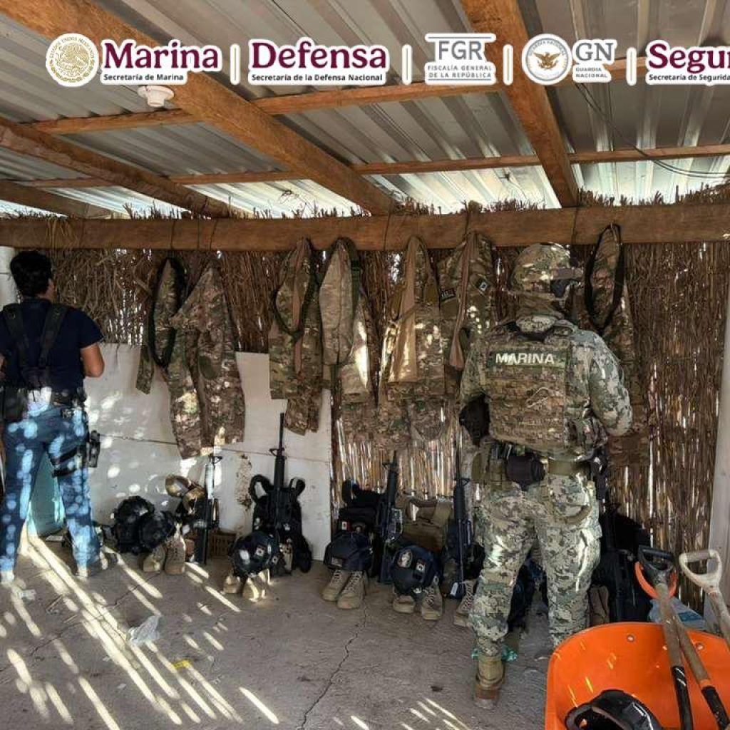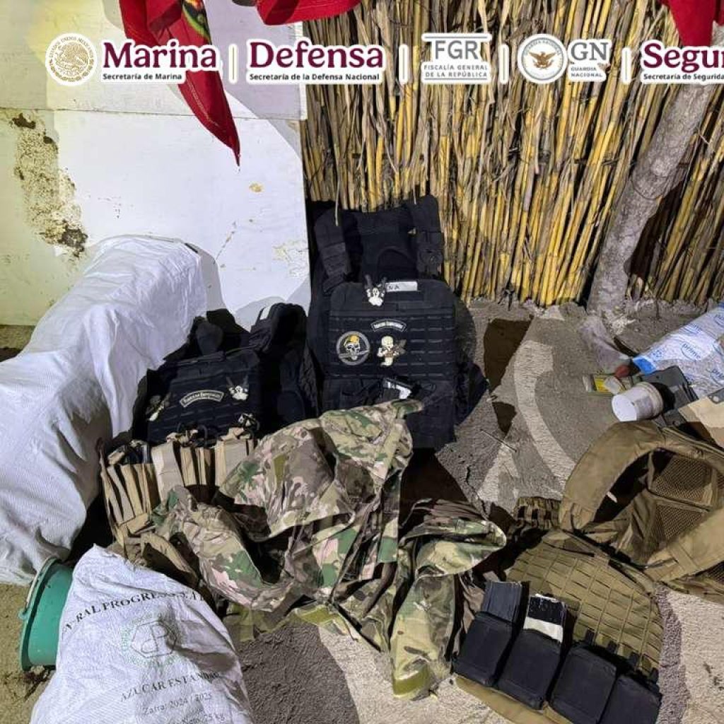 La dependencia detalló que en el cateo se aseguraron seis armas largas, 27 cargadores, 760 cartuchos útiles, 13 chalecos balísticos, 19 cascos balísticos, 14 pares de botas, diverso equipo táctico y 54 dosis de metanfetamina.