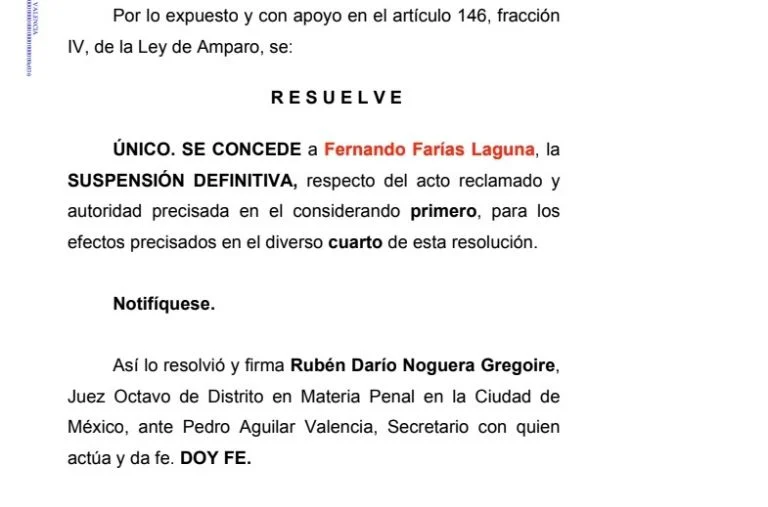 “Se concede al quejoso Fernando Farías Laguna, la suspensión definitiva, para el único efecto de que una vez que sea aprehendido quede a disposición de este Juzgado de Distrito en lo que se refiera a su libertad, en el lugar en que sea internado y a disposición de la autoridad responsable ordenadora para la continuación del procedimiento respectivo”, argumenta la resolución del juez Rubén Noguera.