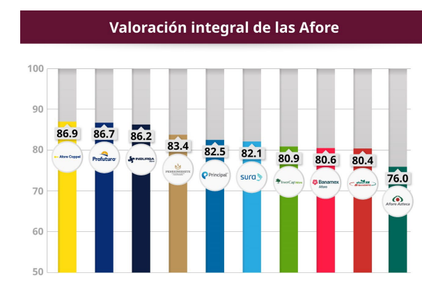 En cuanto al desempeño individual, Afore Coppel obtuvo la calificación más alta con 86.9 puntos, seguida de Profuturo con 86.7 e Inbursa con 86.2 unidades. En el extremo opuesto, Afore Azteca registró la valoración más baja del sistema con 76.0 puntos.