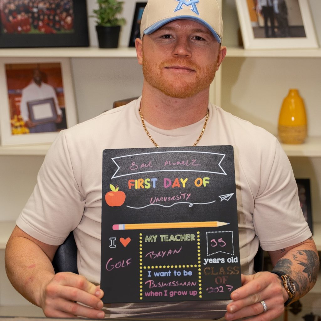 A través de sus redes sociales, el campeón compartió una imagen cargada de simbolismo donde sostiene el tradicional pizarrón de «primer día de clases». Con su propia letra, el tapatío escribió: “Saúl Álvarez, First Day of University”, confirmando que forma parte de la generación 2027 y que está listo para intercambiar los guantes por los libros.