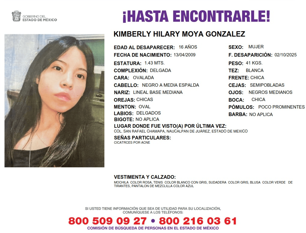 Kimberly Hilary Moya González, estudiante de 16 años del CCH Naucalpan, desapareció el 2 de octubre en el municipio de Naucalpan, Estado de México.