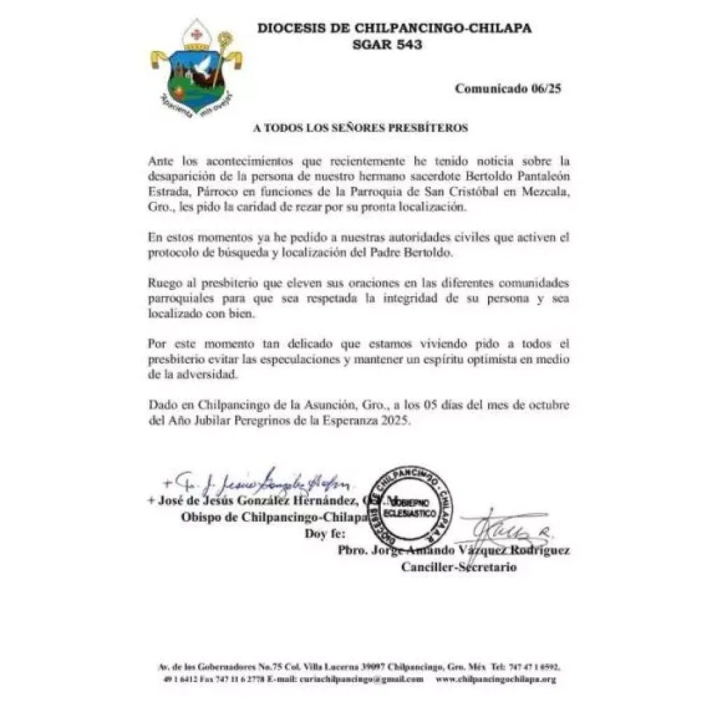 La Diócesis de Chilpancingo-Chilapa informó la desaparición del sacerdote Bertoldo Pantaleón Estrada, párroco de la comunidad de Mezcala, municipio de Eduardo Neri, Guerrero.