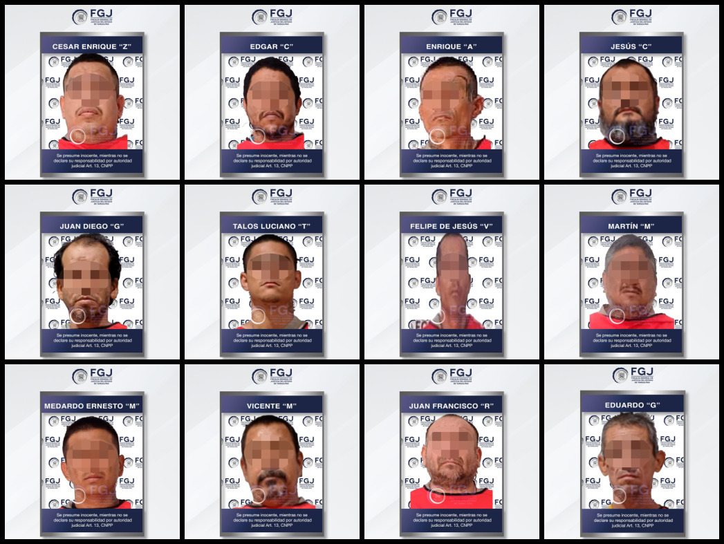 Los detenidos son: César Enrique “Z”, Edgar “C”, Enrique “A”, Jesús “C”, Juan Diego “G”, Talos Luciano “T”, Felipe de Jesús “V”, Martín “M”, Medardo Ernesto “M”, Vicente “M”, Juan Francisco “R”. También , se detuvo a Eduardo “G”, a quien se les ejecutó otra orden de aprehensión por extorsión.