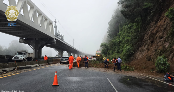 Personal de la autopista, autoridades locales y de la Secretaría de Infraestructura, Comunicaciones y Transportes (SICT) trabajan para retirar tierra y maleza y restablecer la circulación.