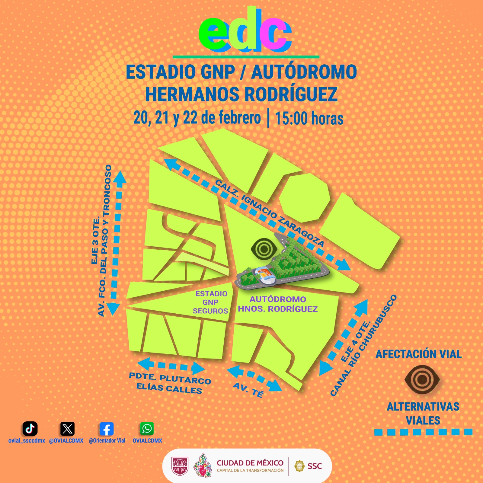 Para el festival de música electrónica, «2026 Electric Daisy Carnival», que se realizará los días 20, 21 y 22 de febrero, la Secretaría de Seguridad Ciudadana (SSC) desplegará un dispositivo de seguridad y vialidad en el Autódromo Hermanos Rodríguez y el Estadio GNP Seguros, localizados en la alcaldía Iztacalco, con el objetivo de garantizar la integridad física y patrimonial de los asistentes.
