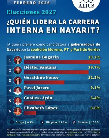 Resultados de un cuestionario realizado por la casa encuestadora y analítica Alius Polls, arrojaron que destaca la senadora del PVEM, Jasmine Bugarín, para la ser la candidata de la coalición Morena, PT y PVEM, rumbo a las elecciones 2027 en Nayarit.