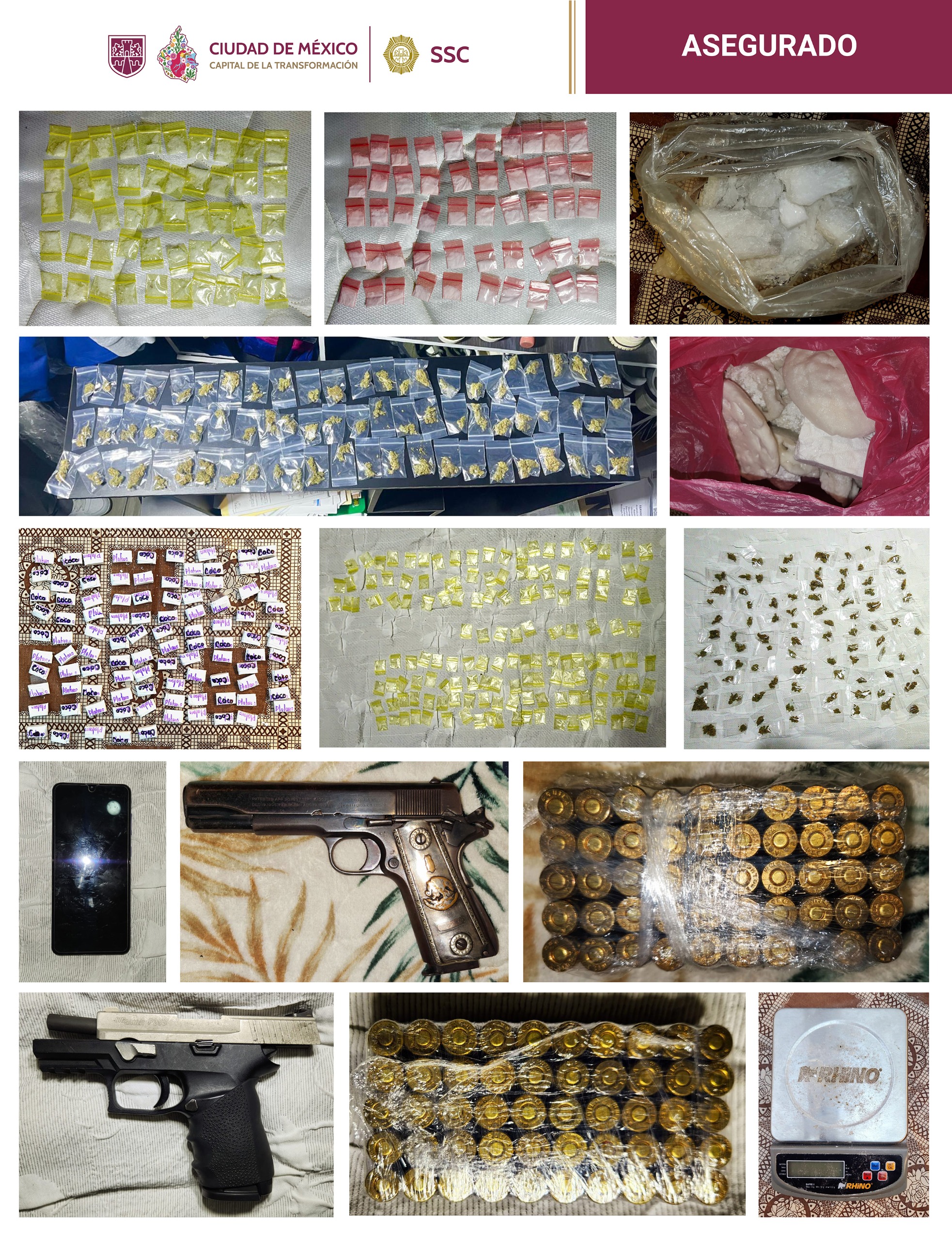 El secretario de la SSC, Pablo Vázquez Camacho, informó que el sujeto fue detenido con tres de sus colaboradores en posesión de más de 500 dosis de droga, dos armas de fuego, cartuchos útiles y una báscula.