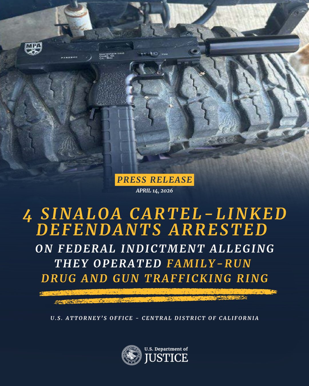 Washington / Ciudad de México. El Departamento de Justicia de los Estados Unidos anunció la captura de cuatro individuos vinculados al cártel de Sinaloa, todos miembros de una misma familia, tras una acusación formal de 29 cargos emitida por un gran jurado federal. Los detenidos son señalados por traficar fentanilo, grandes cantidades de metanfetamina y armas de fuego prohibidas.
