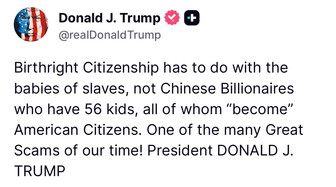 Trump calificó la práctica actual como «una de las muchas grandes estafas de nuestro tiempo», señalando específicamente casos de ciudadanos extranjeros con recursos económicos que viajan a territorio estadounidense con el fin de que sus hijos obtengan la ciudadanía automáticamente. Esta postura se alinea con la agenda de restricciones migratorias de su administración, la cual ha buscado limitar los beneficios derivados de la Enmienda 14 de la Constitución de los Estados Unidos.