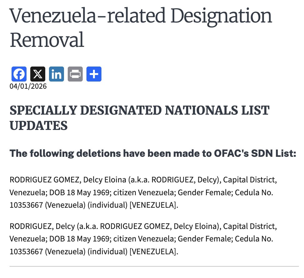 Este miércoles 1 de abril de 2026, la Oficina de Control de Activos Extranjeros (OFAC) del Departamento del Tesoro de los Estados Unidos hizo oficial la eliminación de Delcy Eloína Rodríguez Gómez de su lista principal de sanciones financieras. Con esta decisión, la administración de Donald Trump retira el nombre de la presidenta encargada de Venezuela de la categoría de «Nacionales Especialmente Designados» (SDN), permitiendo potencialmente el inicio de una agenda de cooperación binacional.