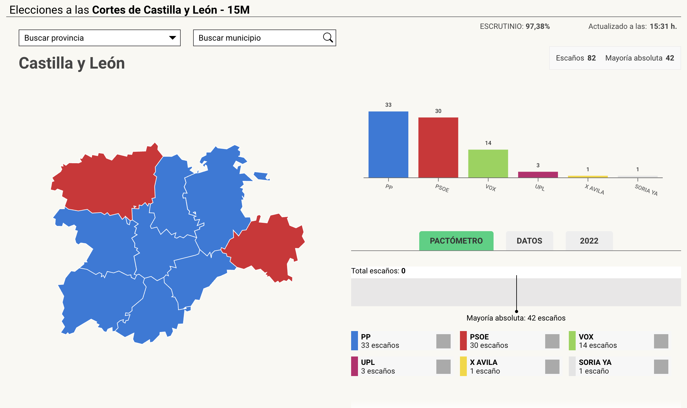 Este domingo 15 de marzo de 2026, Castilla y León celebró una jornada electoral histórica para renovar sus Cortes. Con el 94.66% de los votos escrutados, el Partido Popular (PP) de Alfonso Fernández Mañueco se alza como el vencedor de la contienda con 33 escaños, mejorando en dos procuradores su resultado de 2022. Sin embargo, la victoria es agridulce: el PP queda lejos de la mayoría absoluta, ahora situada en 42 escaños.