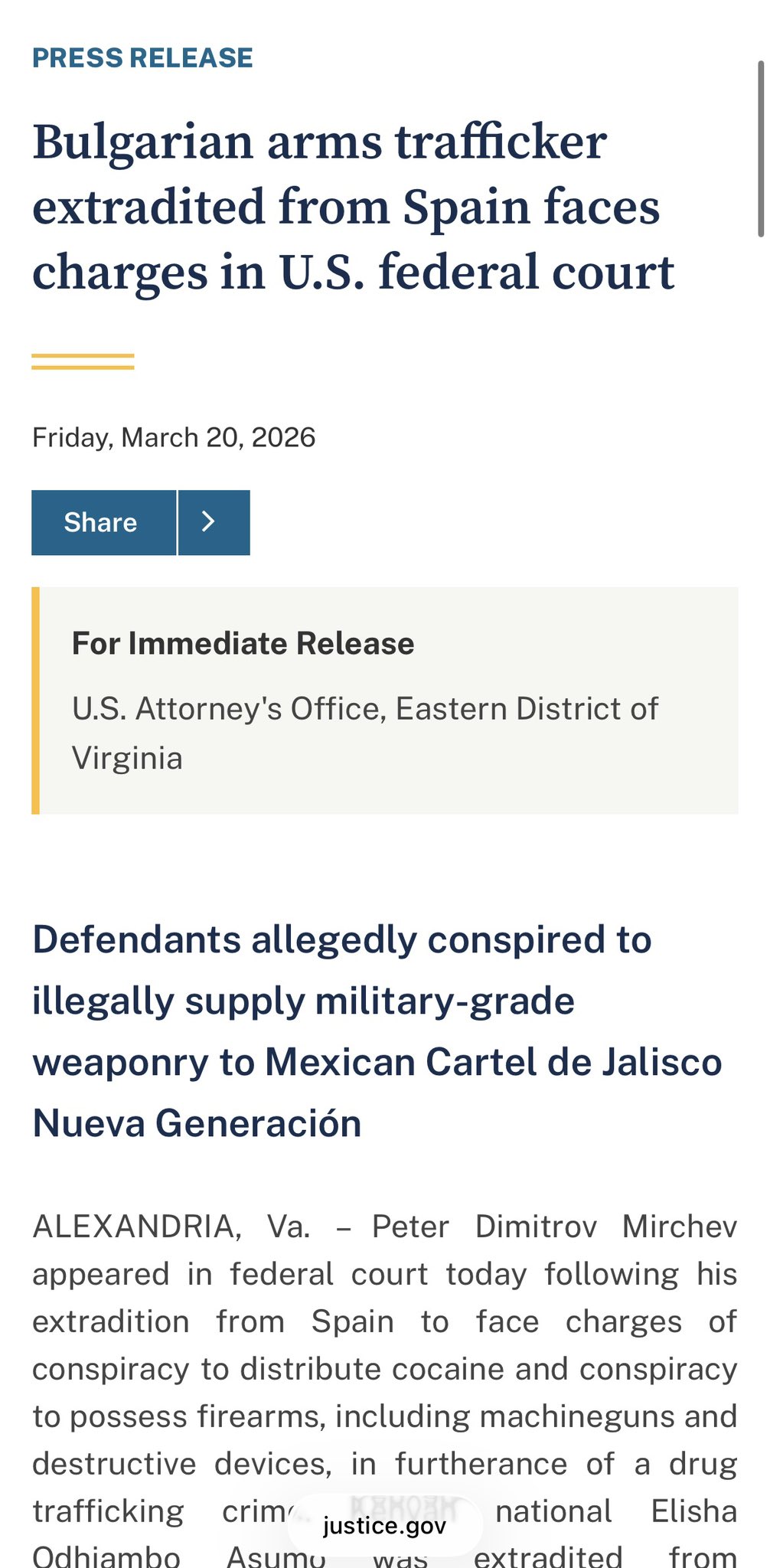 Peter Dimitrov Mirchev, ciudadano búlgaro señalado como traficante de armas, compareció este viernes ante una corte federal en Alexandria, Virginia, tras ser extraditado desde España. El Departamento de Justicia de Estados Unidos acusa de conspirar para suministrar armamento de grado militar al Cartel de Jalisco Nueva Generación (CJNG) a Mirchev y a otros tres individuos: Elisha Odhiambo Asumo, Subiro Osmund Mwapinga y Michael Katungi Mpweire.