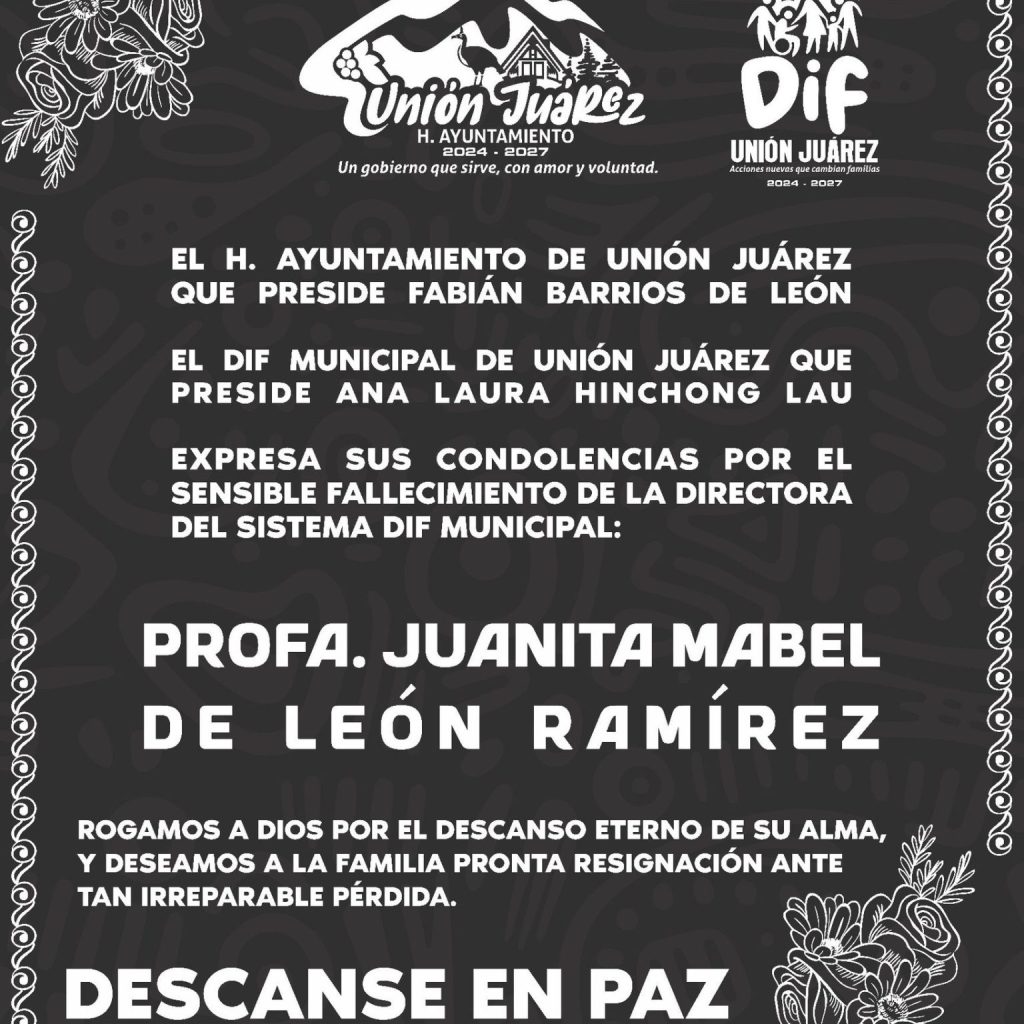 Tras un accidente carretero registrado la noche del pasado lunes 12 de enero, se confirmó el fallecimiento de la profesora Juana Mabel de León Ramírez, Directora del Sistema Nacional para el Desarrollo Integral (DIF) del municipio Unión de Juárez, Chiapas.