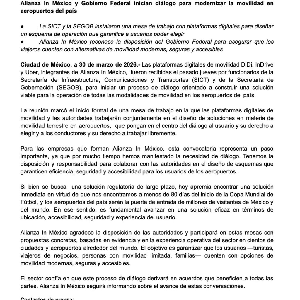 La Secretaría de Infraestructura, Comunicaciones y Transportes (SICT) y la Secretaría de Gobernación (SEGOB) instalaron formalmente una mesa de trabajo con las plataformas digitales de movilidad DiDi, inDrive y Uber, agrupadas en Alianza In México. El objetivo de este diálogo es diseñar un esquema de operación que modernice el transporte terrestre en los aeropuertos del país, permitiendo la coexistencia de todas las modalidades de movilidad.