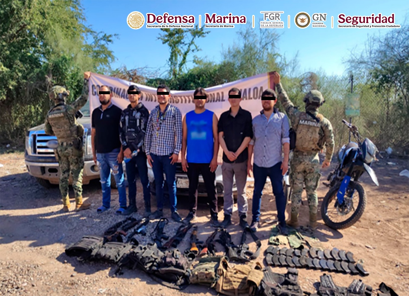 En otra acción, en Navolato, en el poblado Las Trancas, se detuvo a seis personas, les aseguraron nueve armas largas, 26 cargadores, ocho chalecos tácticos, siete pares de placas balísticas, cinco vehículos, tres de ellos con reporte de robo y dos motocicletas.