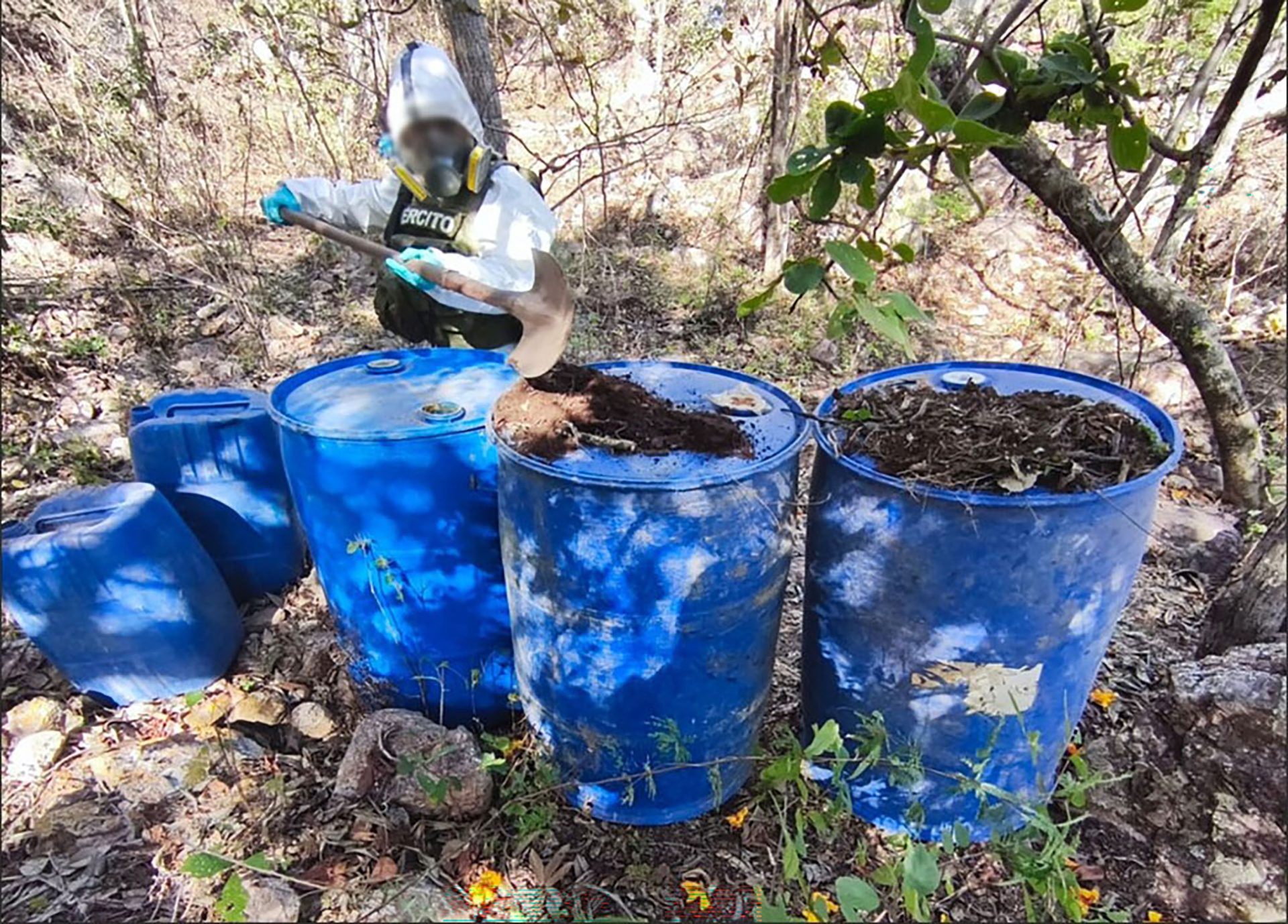Mientras que en Culiacán, en los poblados Los Sabinitos, Lo de Tomás y El Platanar, al efectuar recorridos de reconocimiento se localizaron e inhabilitaron cuatro áreas de concentración de material diverso para la elaboración de metanfetamina, donde se aseguraron 2,810 litros de sustancias químicas.
