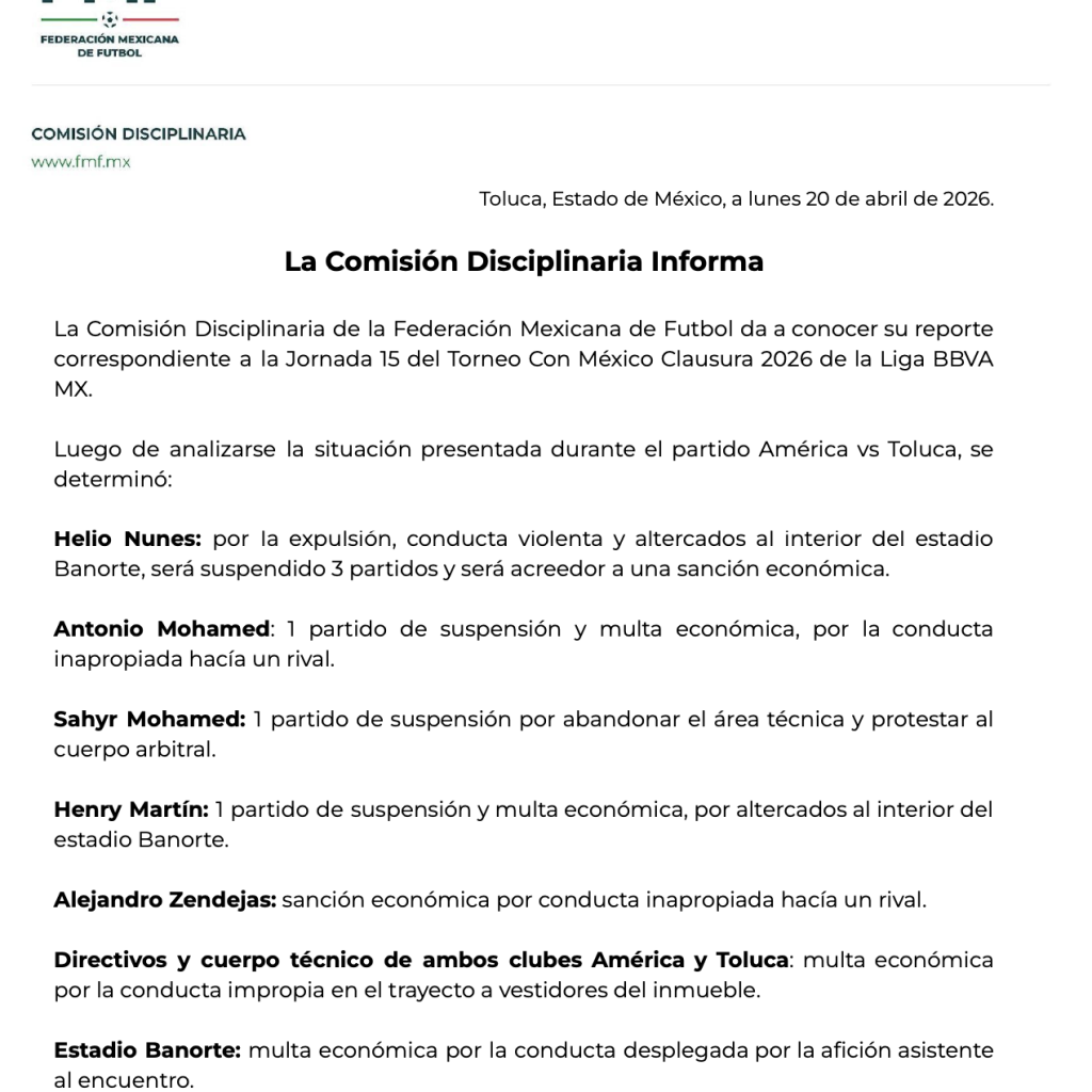 Por parte del Club América, el capitán Henry Martín no se salvó del castigo y recibió un partido de suspensión, además de una multa económica, debido a su involucramiento en los altercados ocurridos en la zona interna del inmueble. Asimismo, Alejandro Zendejas fue objeto de una sanción económica por conducta impropia hacia un oponente. Con esto, las Águilas pierden a su referente ofensivo para el próximo compromiso, lo que representa un reto táctico importante para la institución azulcrema.