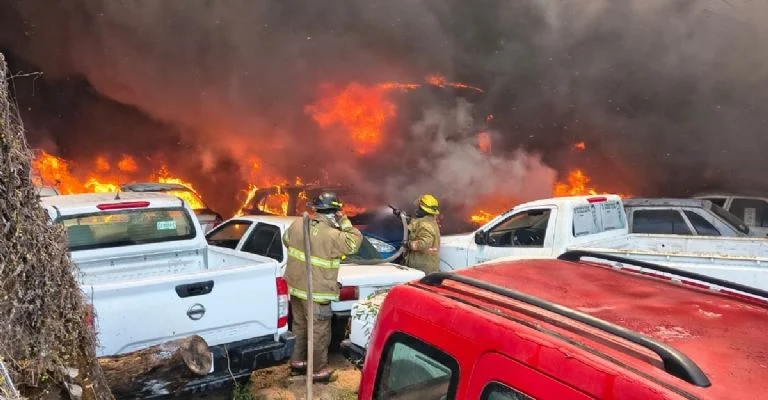 Decenas de vehículos y motocicletas quedaron reducidos a cenizas en el depósito «San Antonio»; Protección Civil y Bomberos reportan cierre total de la circulación y una densa columna de humo que afecta la visibilidad.
