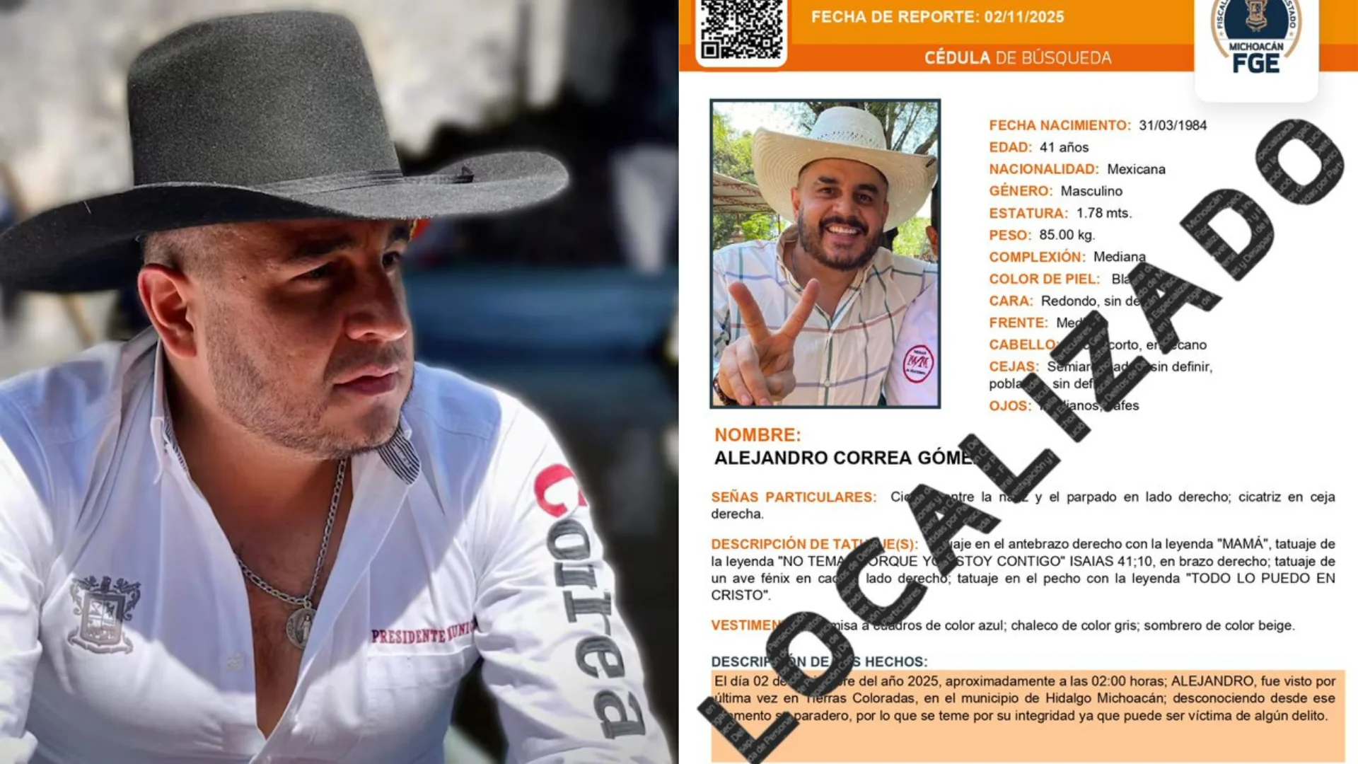 La Fiscalía General del Estado (FGE) de Michoacán informó que fue localizado con vida Alejandro Correa Gómez, ex presidente municipal de Zinapécuaro. Correa Gómez había sido reportado como desaparecido el pasado 2 de noviembre.