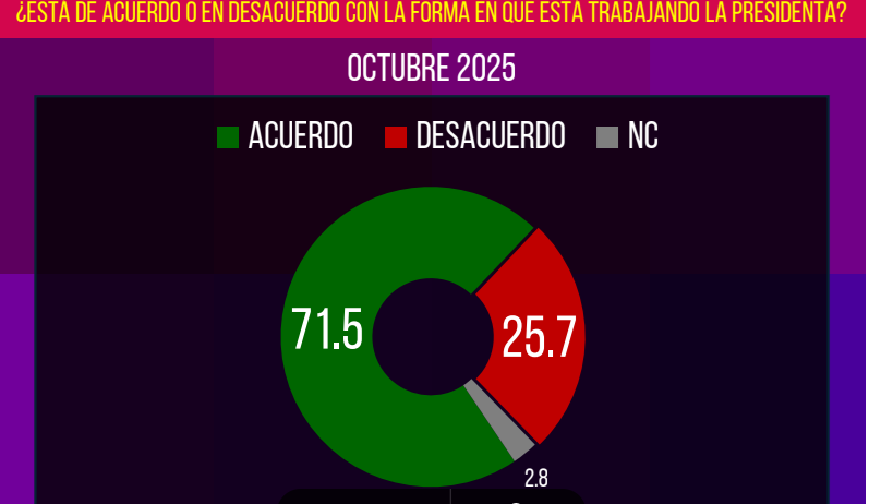 De acuerdo con la encuesta realizada por Mitofsky, la presidenta de la República, Claudia Sheinbaum Pardo, cuenta con la aprobación de 71.5 por ciento de los encuestados, un aumento de 10 puntos porcentuales en comparación a octubre del año pasado.