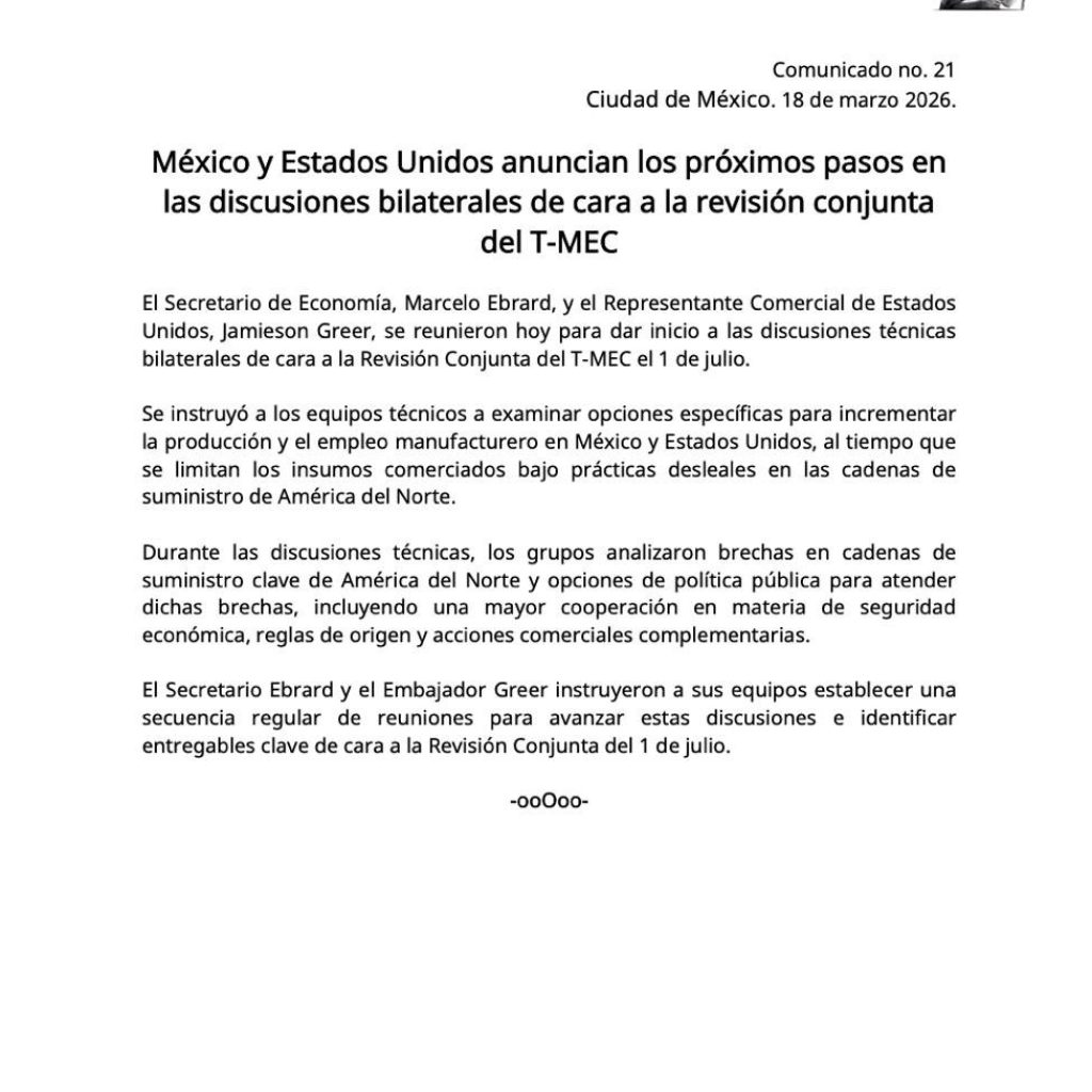 Además, ambos países instruyeron a sus equipos a analizar medidas para fortalecer la producción y el empleo manufacturero en la región. En este contexto, la revisión del T-MEC busca fortalecer la integración económica en América del Norte.