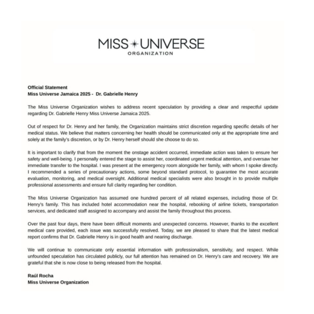 La organización de Miss Universo compartió una actualización del estado de salud de Miss Jamaica, Gabrielle Henry, tras su caída del escenario durante la pasarela de vestidos de noche el pasado 19 de noviembre.