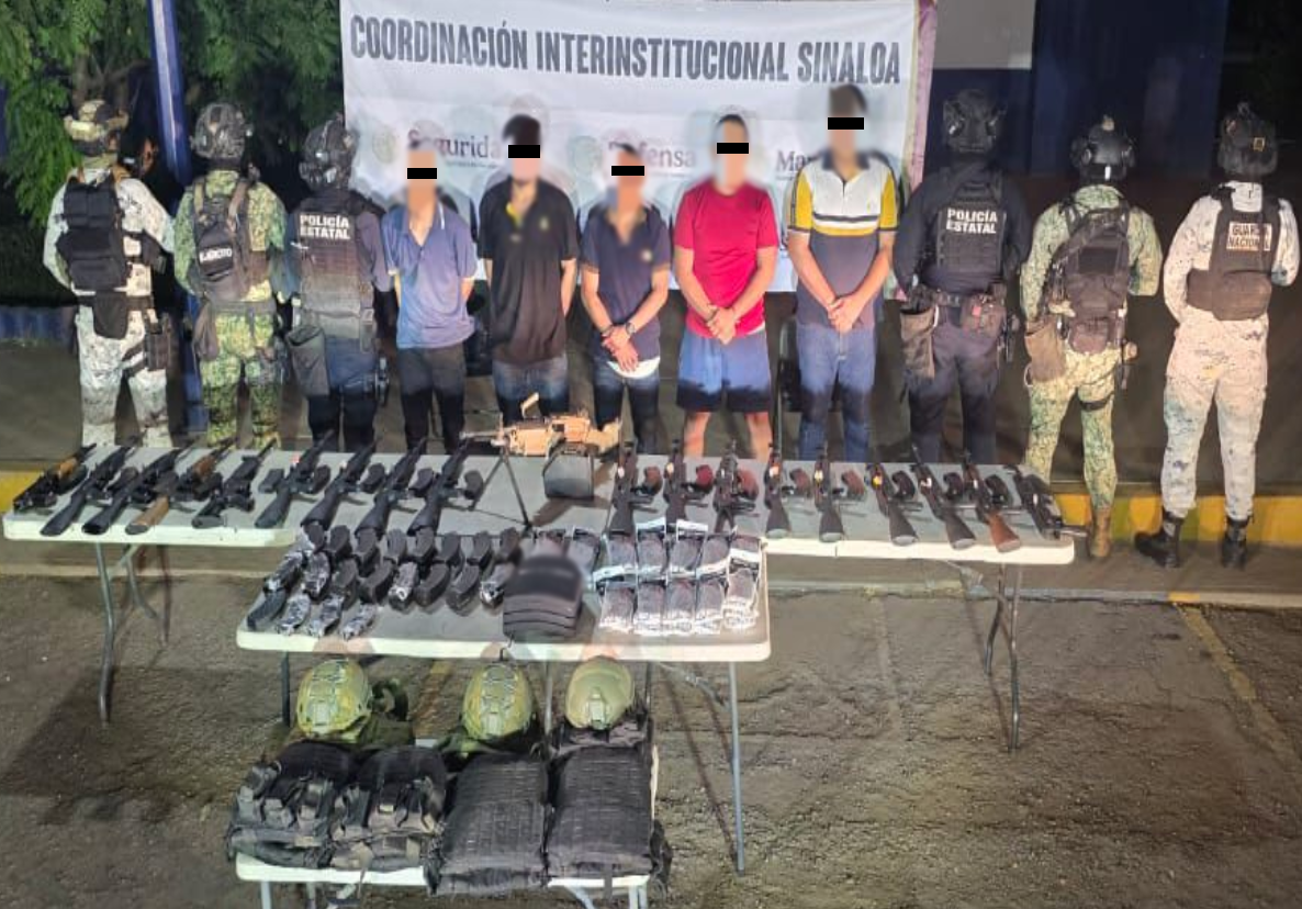 Mientras que en Culiacán, se detuvo a cinco personas, se aseguró una ametralladora, 20 armas largas, 77 cargadores, mil 515 cartuchos, 25 artefactos explosivos improvisados, siete chalecos tácticos, dos vehículos y un inmueble.