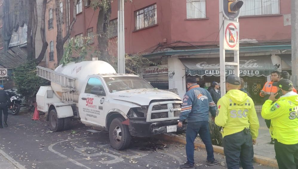Este lunes se registró el choque de una pipa que transportaba Gas LP contra árboles y diversas estructuras entre las calles Av. Cuauhtémoc y Dr. Olvera, ubicadas en la colonia Doctores, Alcaldía Cuauhtémoc, en la Ciudad de México.