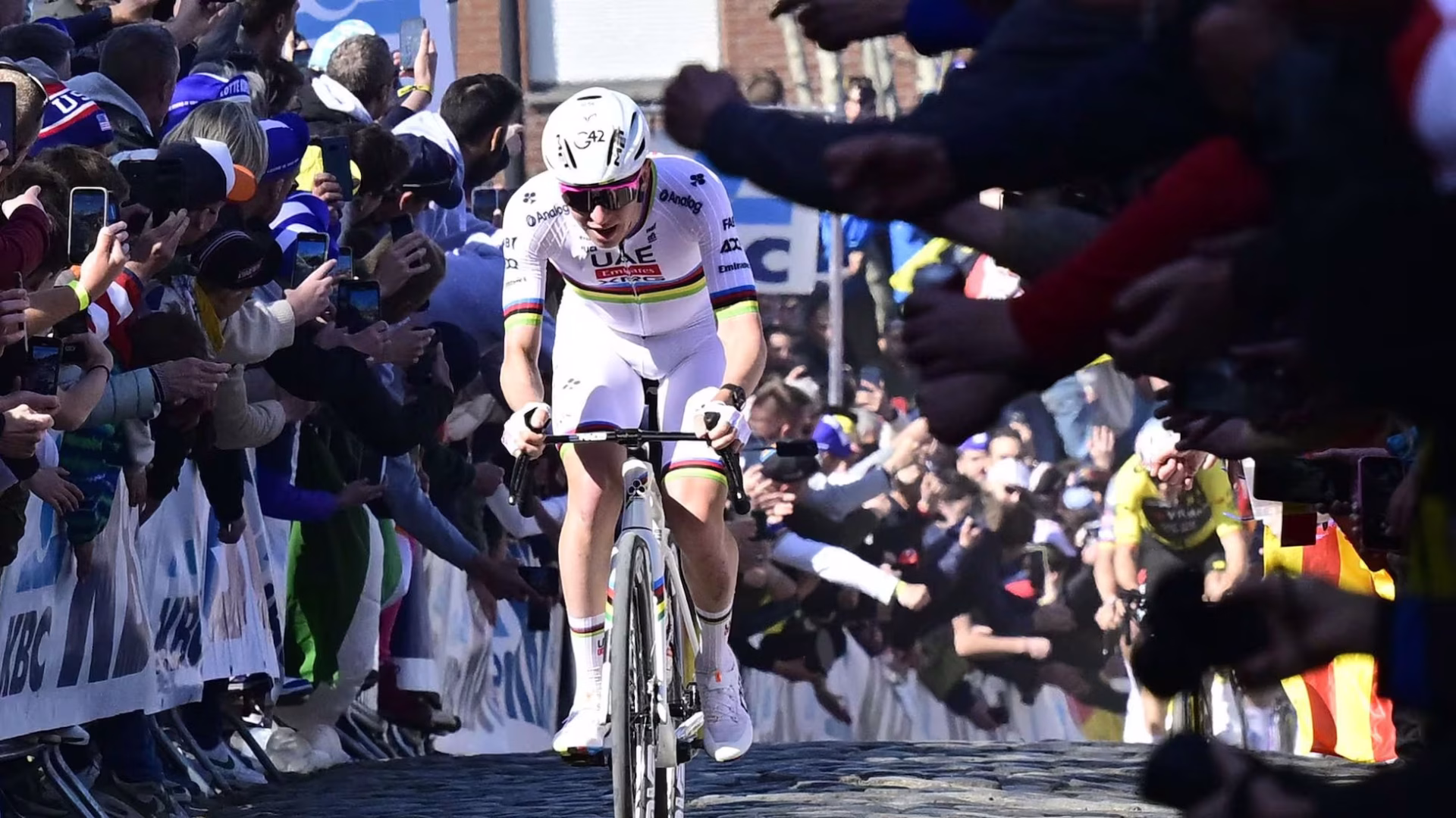El momento decisivo se produjo a 19 kilómetros de la meta, cuando Pogacar aceleró en el Oude Kwaremont, una colina de 2.2 kilómetros conocida por su empedrado y pendientes desafiantes. Este ataque le permitió abrir una brecha significativa, consolidando su ventaja y asegurando una victoria en solitario.