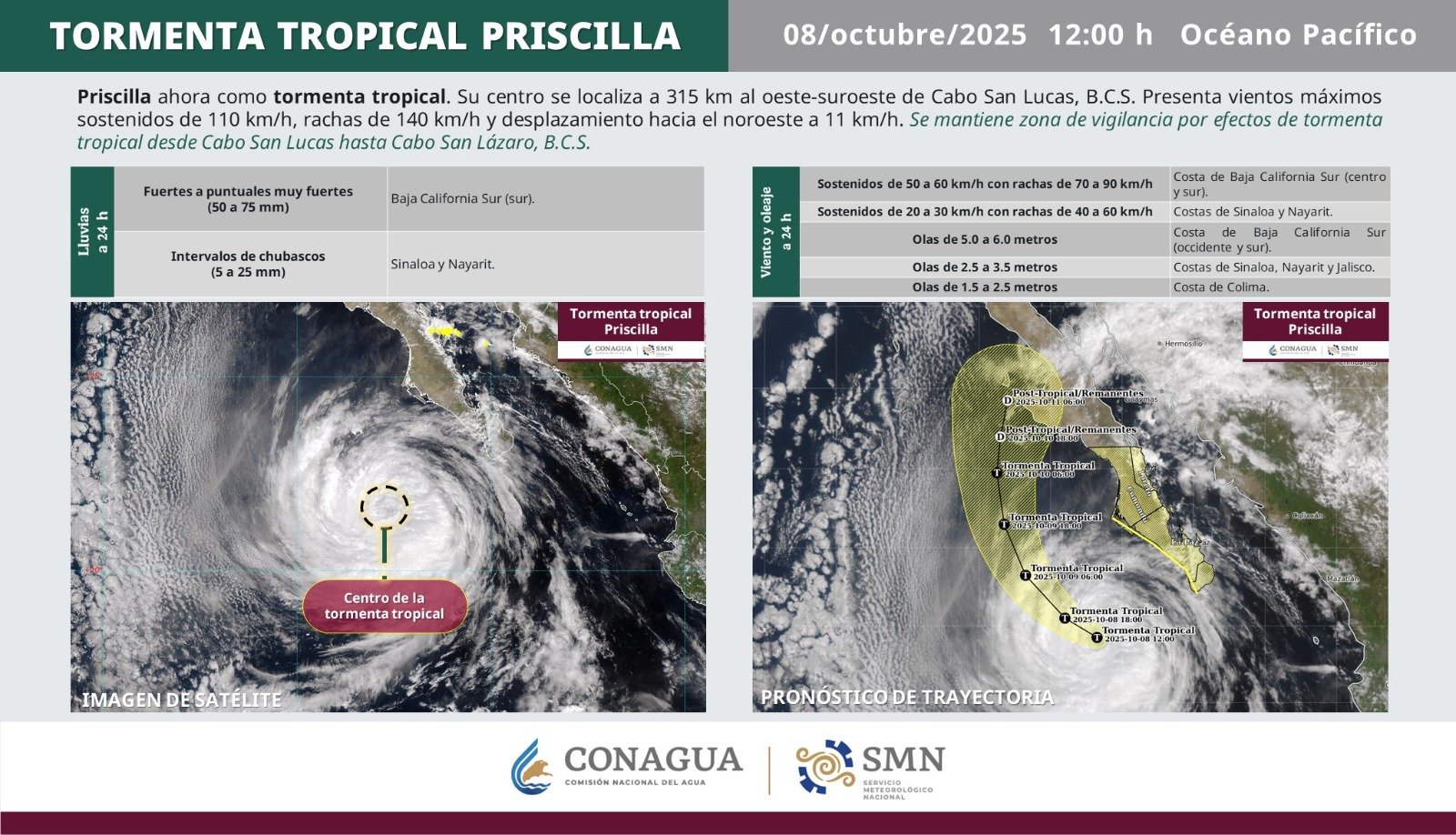 La tarde de este miércoles “Priscilla” se degradó a tormenta tropical, pero se mantiene el pronóstico de lluvias muy fuertes, rachas de viento intensas y oleaje elevado en Baja California Sur.