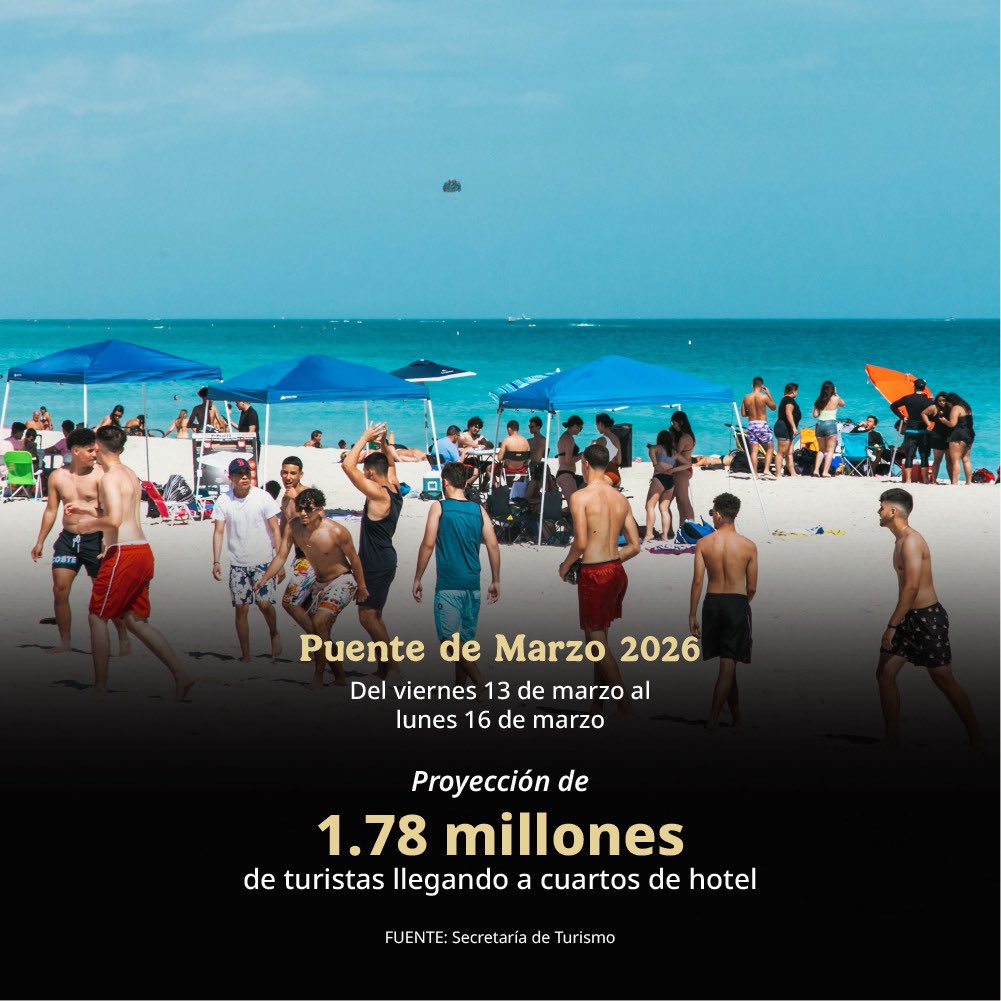 La secretaria de Turismo, Josefina Rodríguez Zamora, dio a conocer que con motivo del puente vacacional de marzo, que comprende del viernes 13 al lunes 16 de marzo de 2026, se estima la llegada de 1.78 millones de turistas a cuartos de hotel en el país.