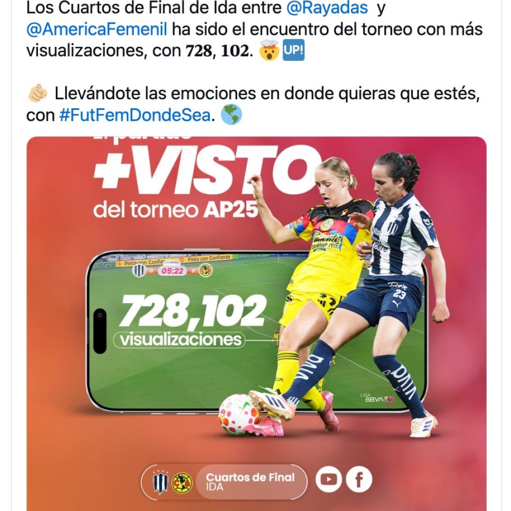 La fuerza de la liga se demuestra al nivel de los grandes eventos. El Clásico Nacional entre América y Chivas de la jornada 11 se erigió como el partido más visto de la historia reciente, atrayendo a 1.26 millones de espectadores. Este duelo no solo reafirmó su gran relevancia, sino que demostró que es capaz de rivalizar en seguimiento con muchos encuentros de la categoría varonil en México.