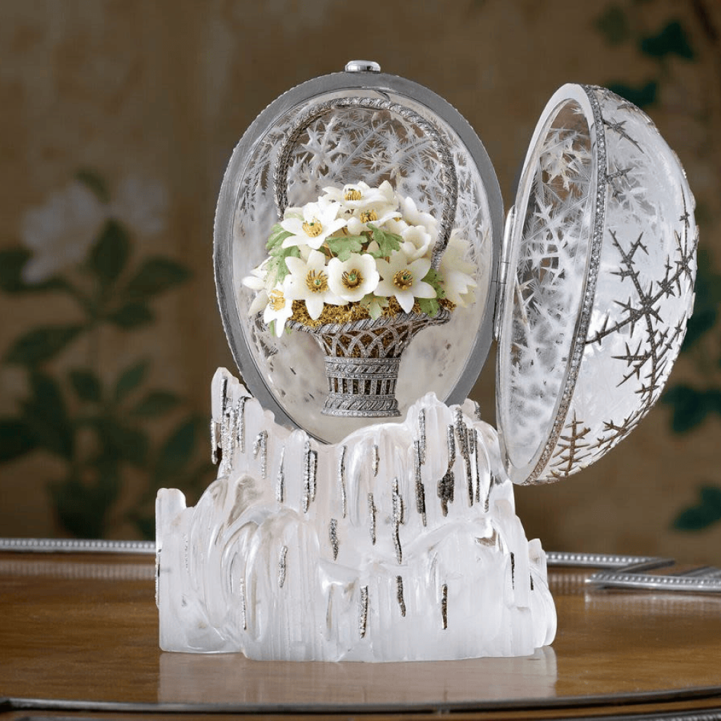 El huevo y su base están tallados en cristal de roca, confiriéndole un carácter traslúcido. Está culminado por copos de nieve de platino, engastados con un estimado de 4 mil 500 diamantes de talla rosa, según la ficha original de la obra.