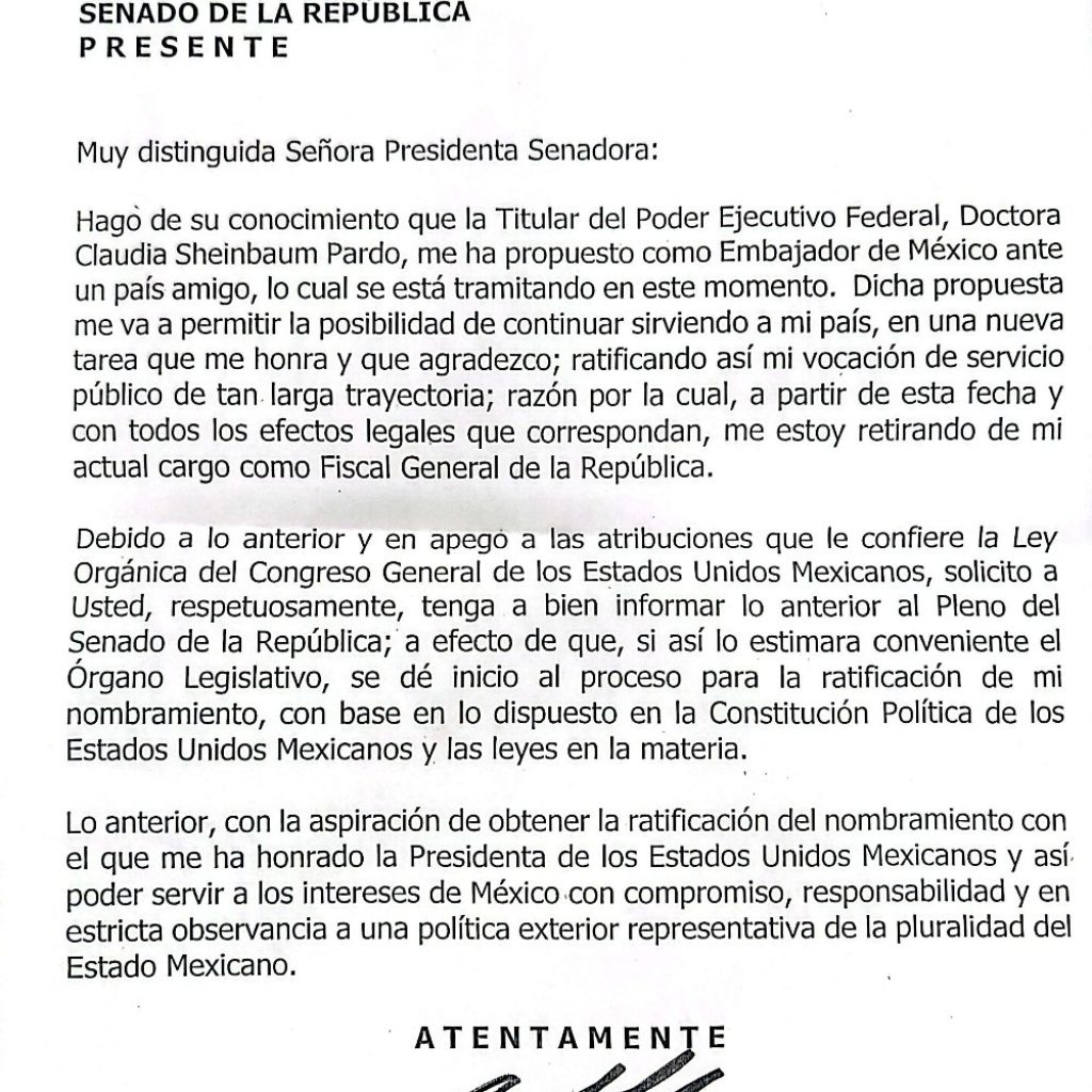 Gertz Manero presentó una carta dirigida a la presidenta de la Mesa Directiva, Laura Itzel Castillo Juárez, es la que hace del conocimiento que la presidenta, Claudia Sheinbaum, le propuso ser “Embajador de México ante un país amigo”, lo cual aseguró que ya está en trámite.