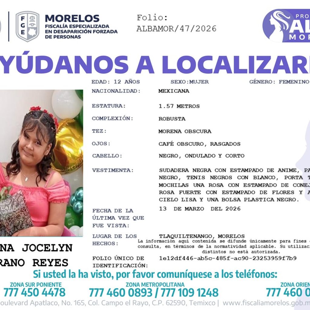 En otro caso, autoridades también difundieron la ficha para localizar a Ximena Jocelyn Serrano Reyes, cuya desaparición fue reportada recientemente en la entidad. Ambos casos se suman a otros reportes de desapariciones en Morelos que en las últimas semanas han generado movilización de familiares, colectivos y autoridades, quienes mantienen operativos y difusión de las fichas para facilitar su localización.