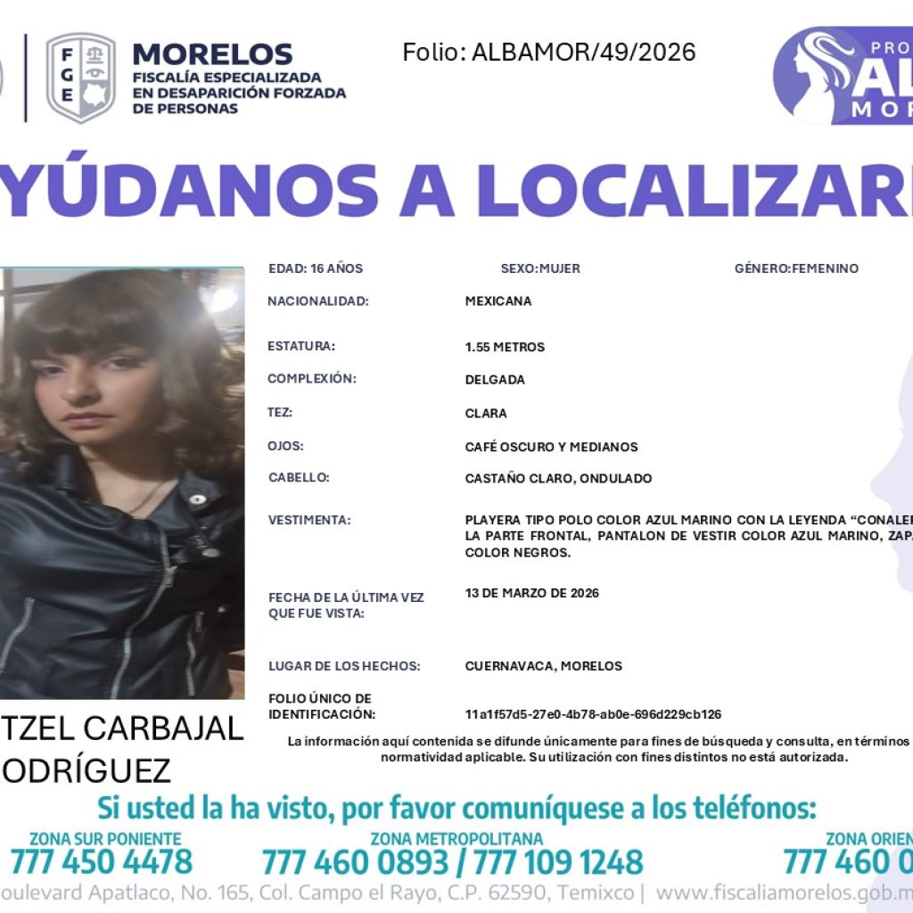 La Fiscalía General del Estado informó que se activó el Protocolo Alba para dar con el paradero de Rubí Itzel Carbajal Rodríguez, una estudiante de 16 años, quien fue vista por última vez el 13 de marzo de 2026 en el municipio de Cuernavaca. De acuerdo con la ficha de búsqueda, la menor mide aproximadamente 1.55 metros, es de complexión delgada, tez clara, ojos café oscuro y cabello castaño claro ondulado. Al momento de su desaparición vestía playera tipo polo azul marino con la leyenda “Conalep”, pantalón de vestir azul marino y zapatos negros.