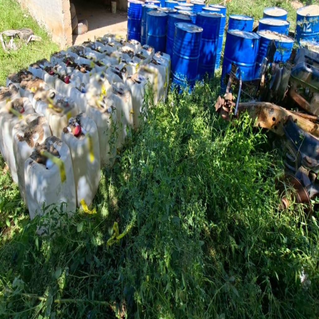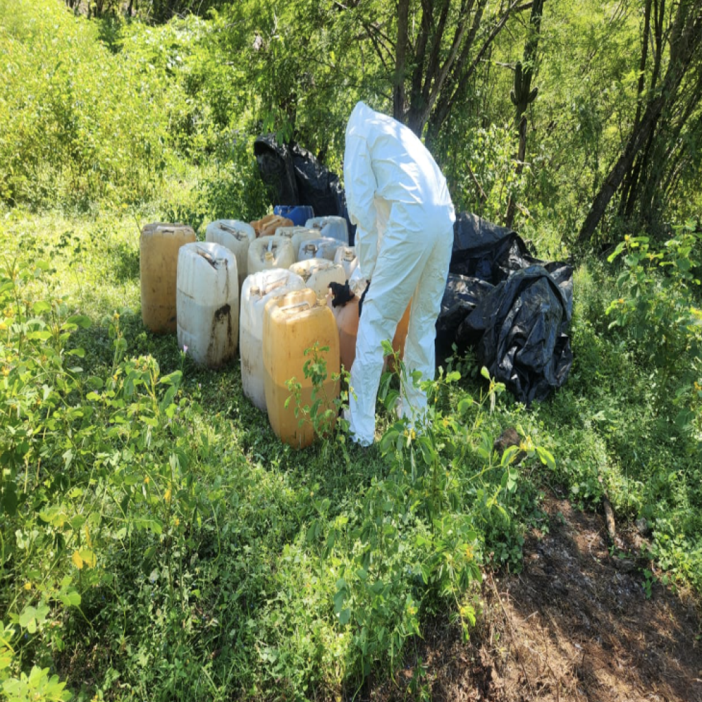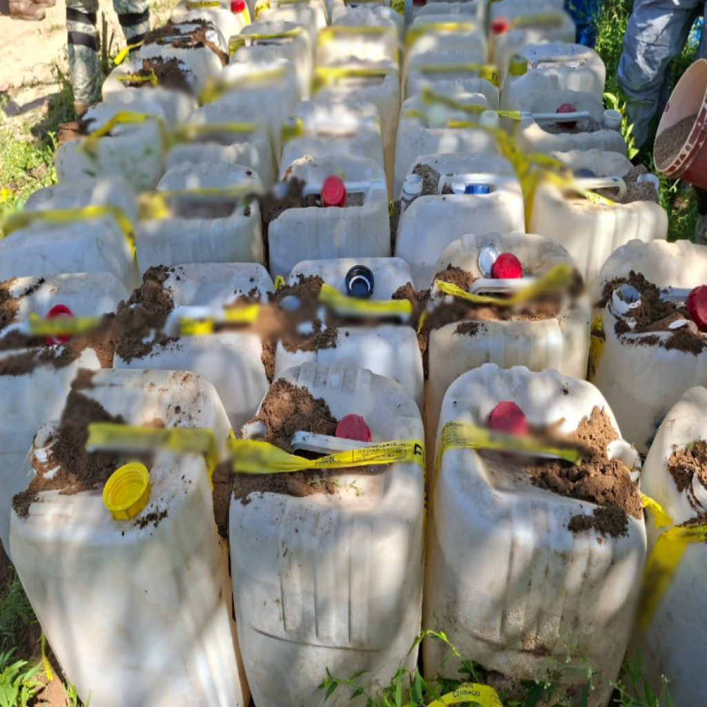 En otra acción en Culiacán, se localizaron e inhabilitaron tres áreas de almacenaje con material diverso para la fabricación de drogas sintéticas, se aseguraron 2,840 litros y 50 kilos de sustancias para la elaboración de metanfetamina.