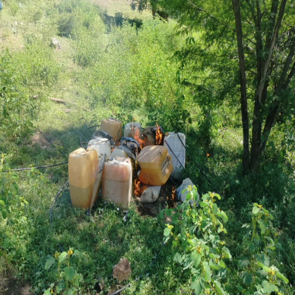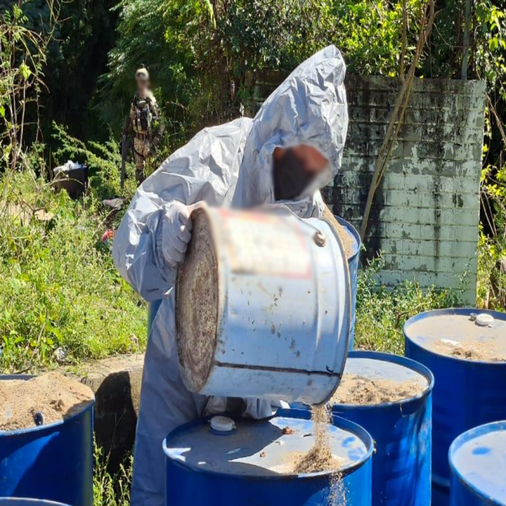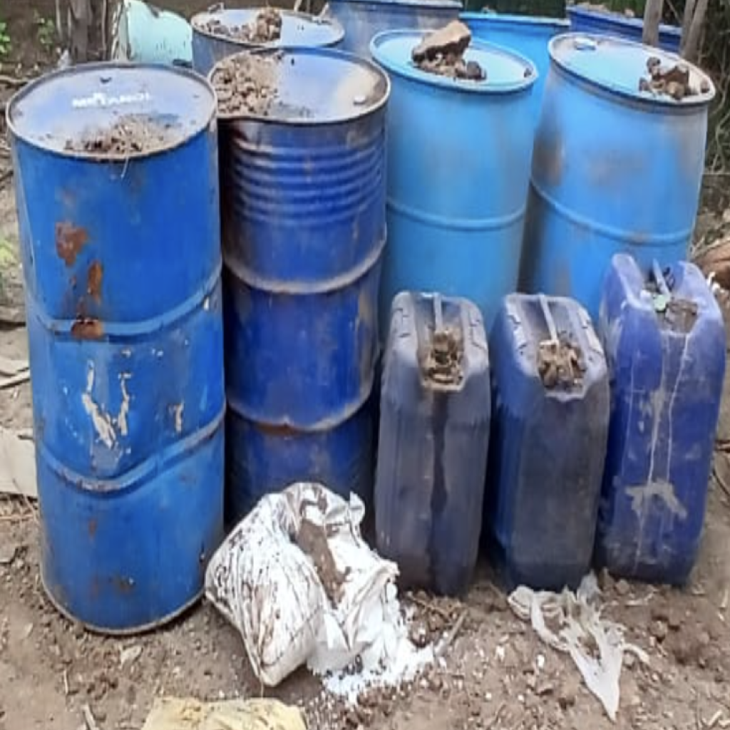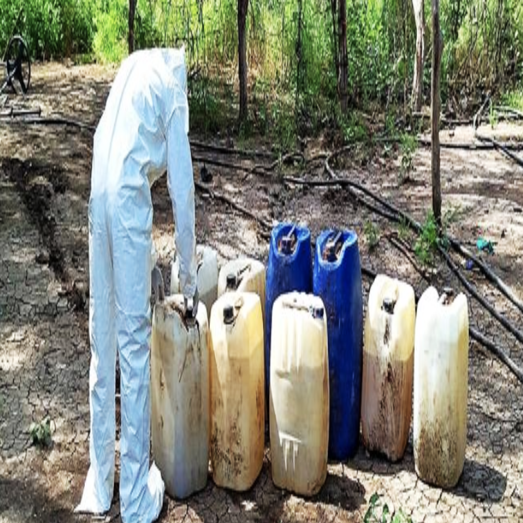 En otra acción en Culiacán, se localizaron e inhabilitaron tres áreas de almacenaje con material diverso para la fabricación de drogas sintéticas, se aseguraron 2,840 litros y 50 kilos de sustancias para la elaboración de metanfetamina.