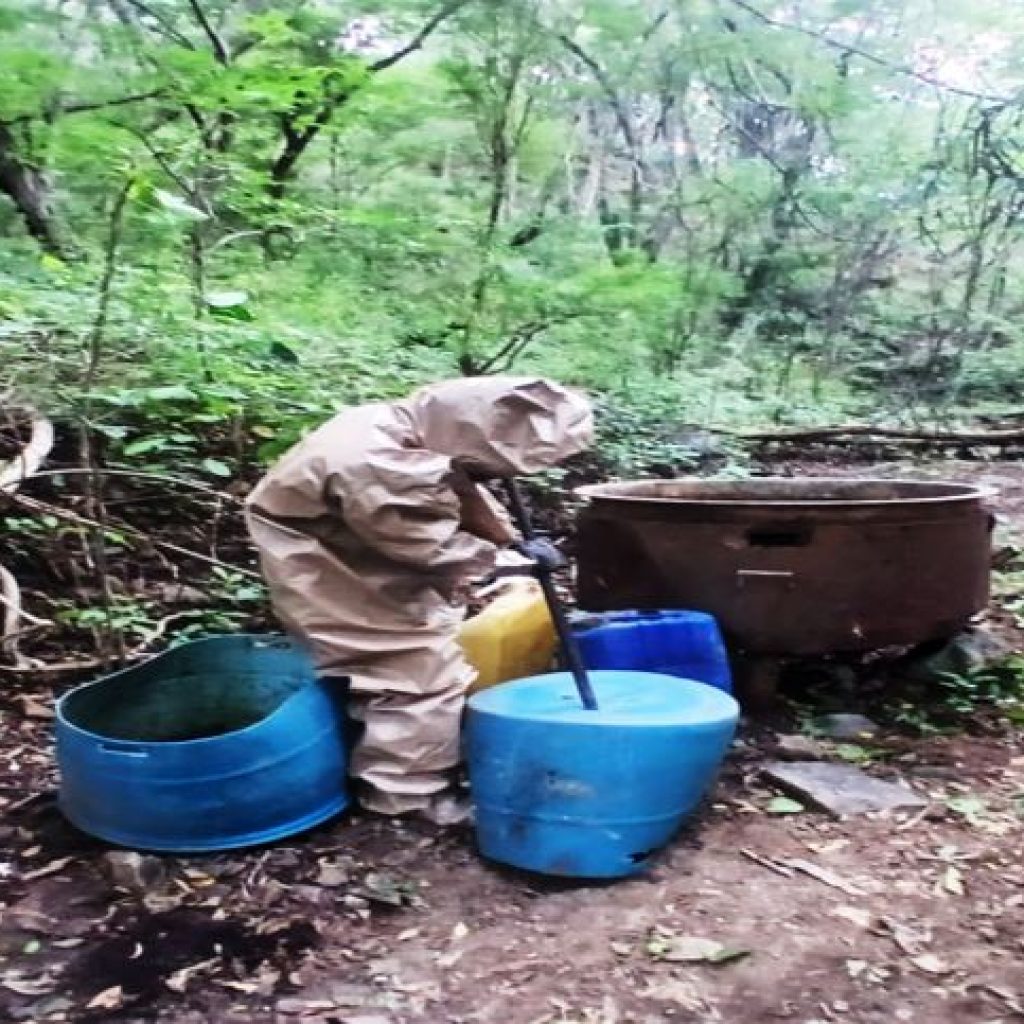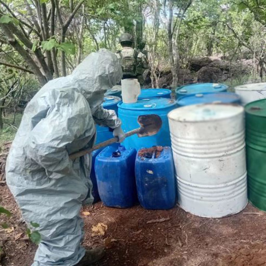 En Cosalá, Sinaloa se localizaron e inhabilitaron tres áreas de concentración de material diverso para la fabricación de drogas sintéticas, se aseguraron 2,350 litros de sustancias para la elaboración de metanfetamina. La afectación económica a la delincuencia organizada es de 47 millones de pesos.