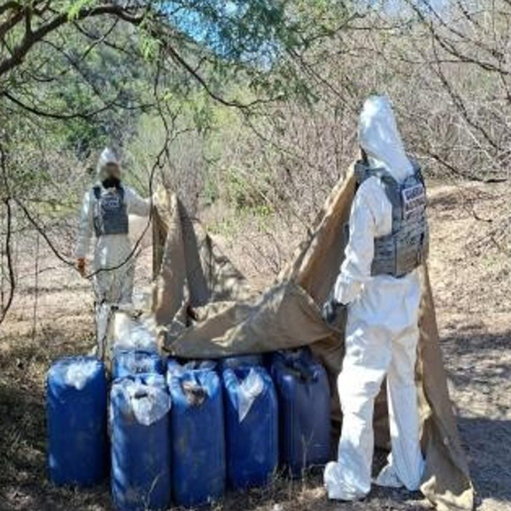Asimismo, en Sinaloa se localizó e inhabilitó un área de concentración de material diverso para la fabricación de drogas sintéticas, se aseguraron 915 litros y 25 kilos de sustancias para la elaboración de metanfetamina.