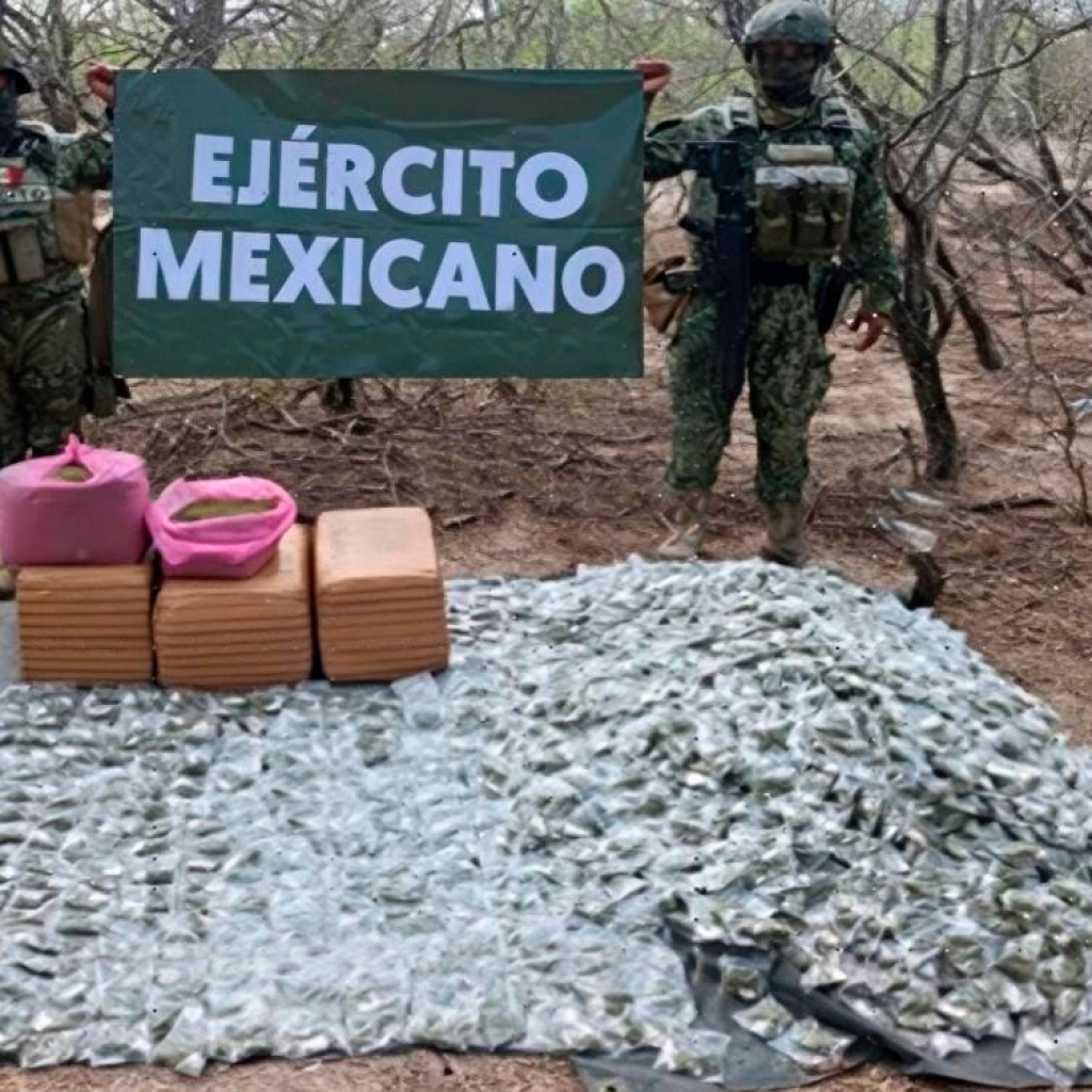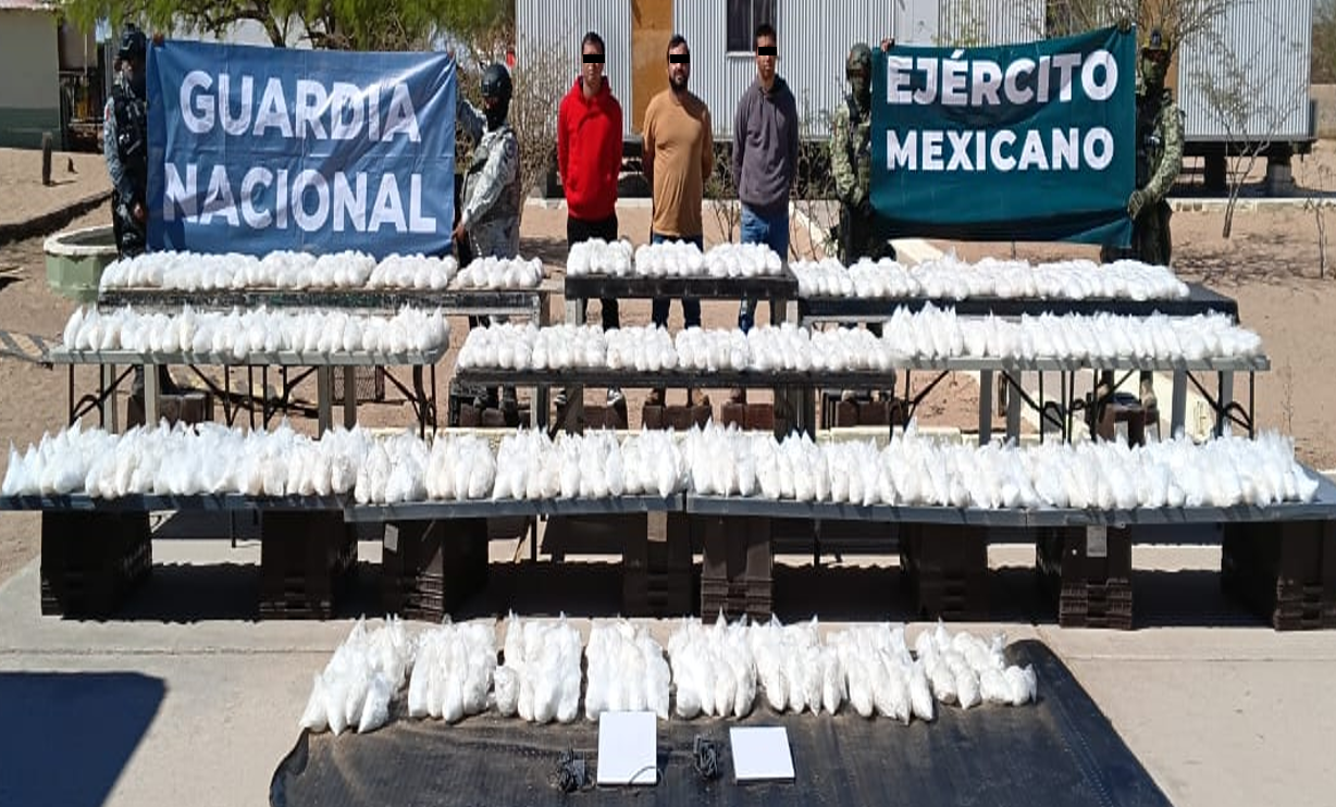 Por otro lado, en San Luis Río Colorado, Sonora, se detuvo a tres personas, se aseguraron 493 kilos de metanfetamina, dos antenas satelitales y dos vehículos. Asimismo, en Reynosa, Tamaulipas, se aseguraron 38 kilos y 3,200 dosis de marihuana.