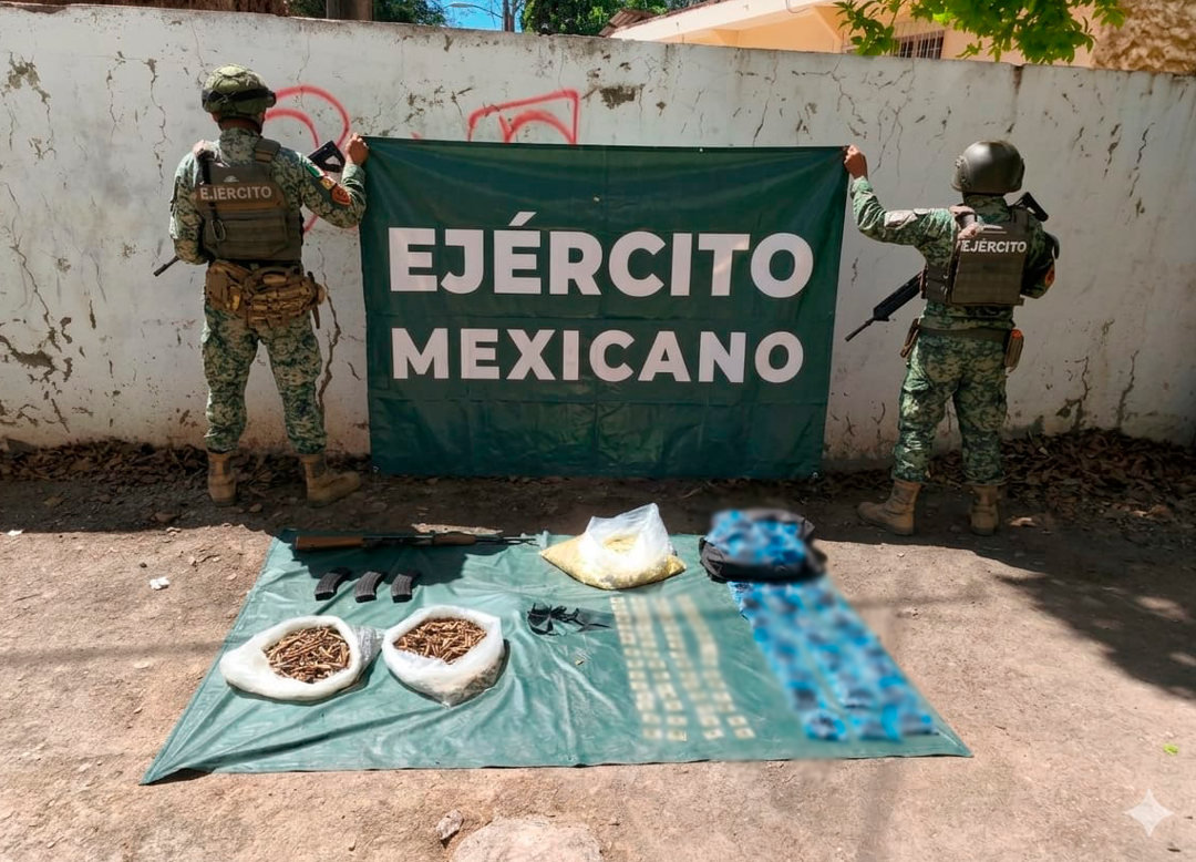 Otra acción se llevó a cabo en Concordia, Sinaloa, donde se aseguró un arma de fuego, 14 artefactos explosivos improvisados, tres cargadores, 802 cartuchos, 2,000 dosis de metanfetamina y 65 dosis de marihuana.