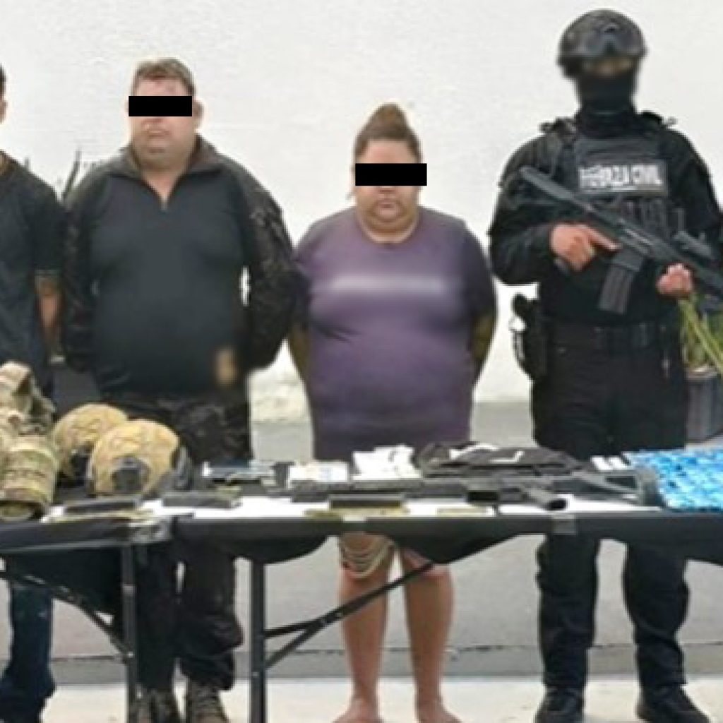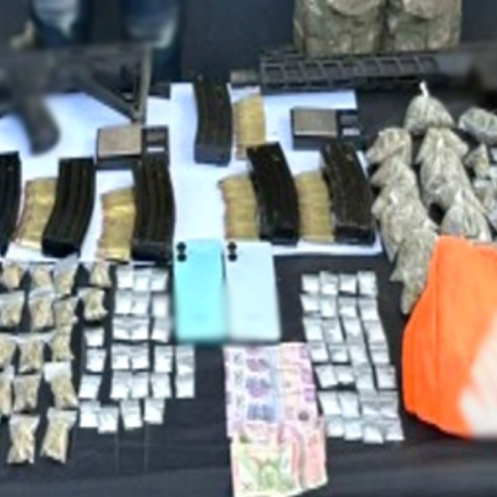 En Linares, Nuevo León, se detuvo a cinco personas, entre ellas dos menores de edad, se aseguraron cinco armas de fuego, 11 cargadores, 182 cartuchos, 163 dosis de metanfetamina, 261 dosis de marihuana, dinero en efectivo, cinco teléfonos celulares, cuatro chalecos tácticos y cinco básculas digitales.